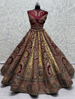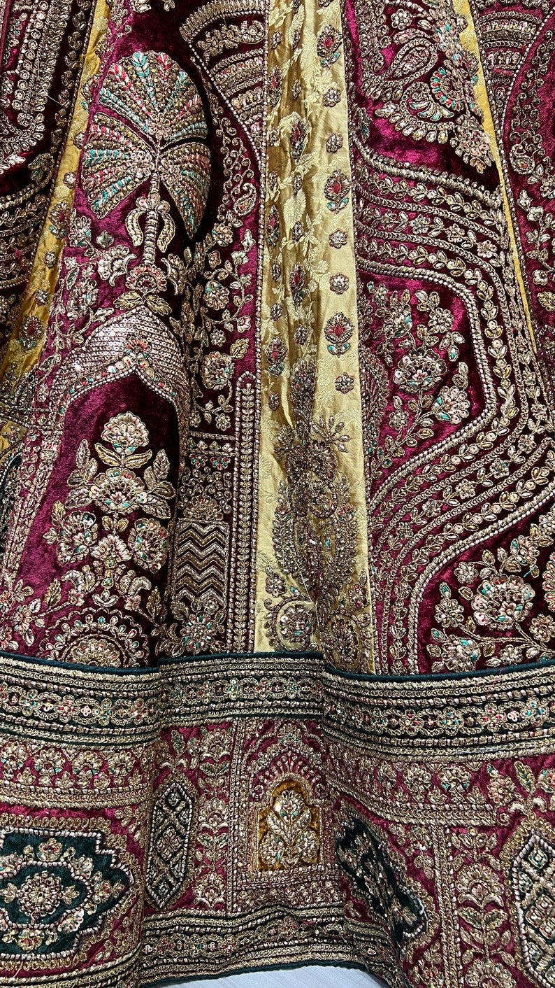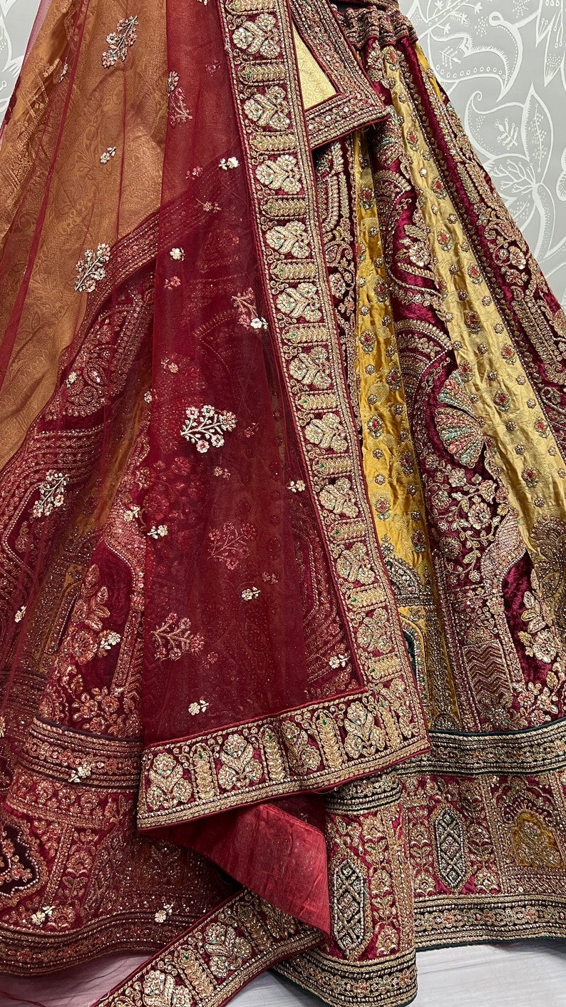 This delightful diva accoutre features unique styling and unusual material. Spread the aura of freshness with this green velvet a line lehenga choli showing a touch of sensuality. This beautiful attire is showing some amazing embroidery done with diamond, dori work, embroidered, multi and thread work. Comes with matching choli and dupatta. (Slight variation in color, fabric & work is possible. Model images are only representative.)
