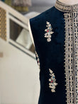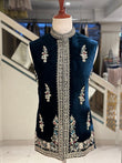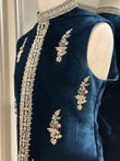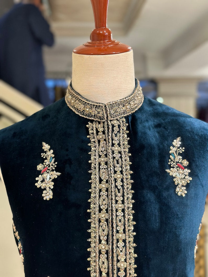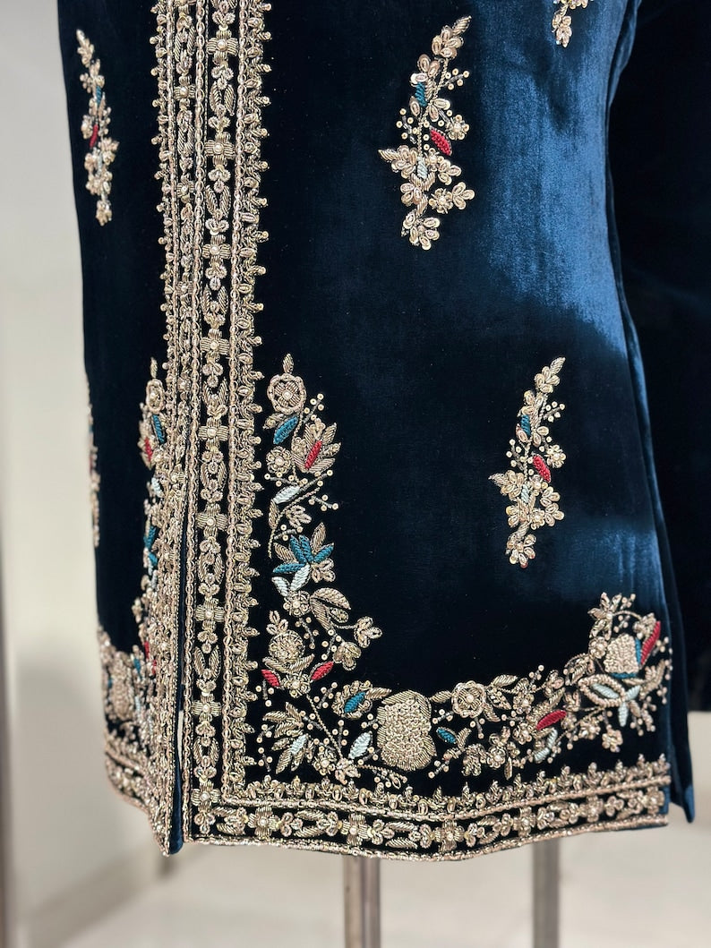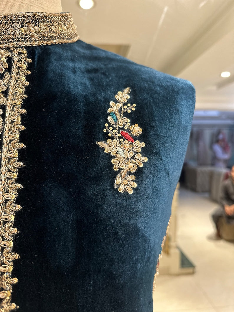 Indulge in the richness of our Dark Teal Blue Velvet waistcoat, a testament to opulence and style. Crafted from exquisite shaffon silk velvet, a rarity in attire, this waistcoat exudes luxury. The hand stitched zardozi work intricately embellishes the front, skirtings and chaaks, creating a masterpiece that speaks volumes. The touch of teal and red resham embroidery adds contrasting charm. making this piece a true work of art.