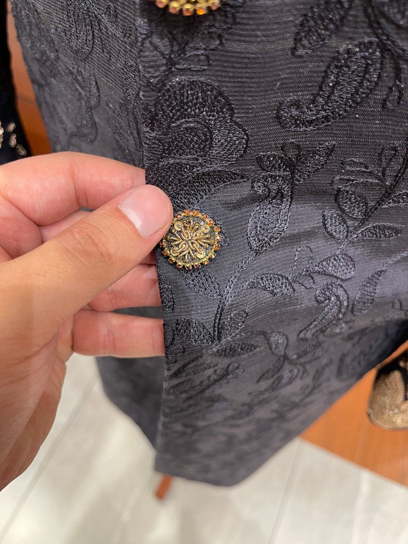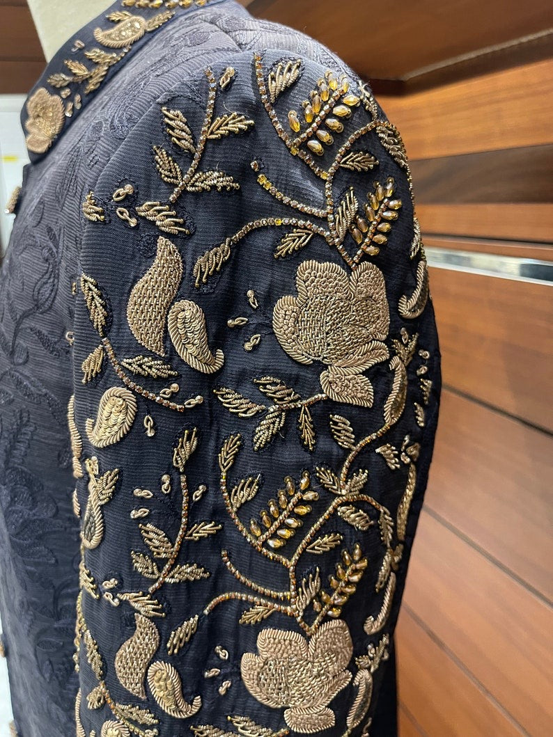•The sherwani's arms are fully embellished with heavy zardozi work, showcasing a stunning floral print that exudes sophistication and artistry.