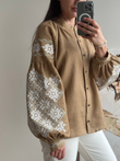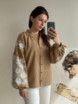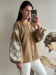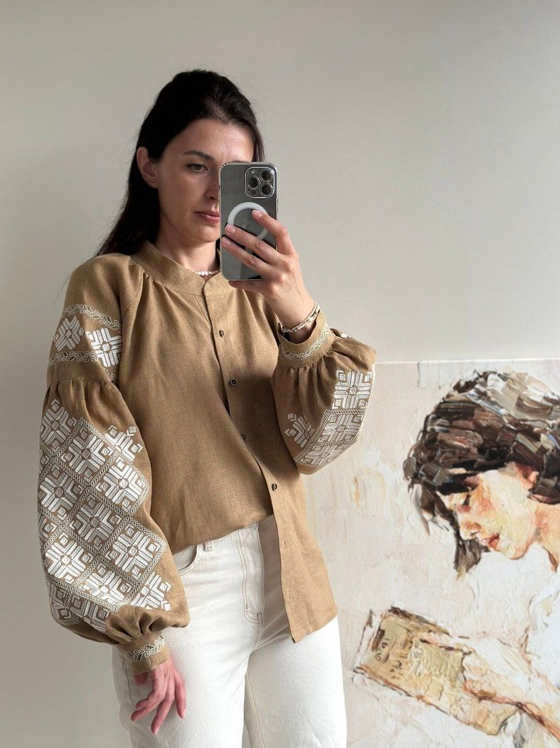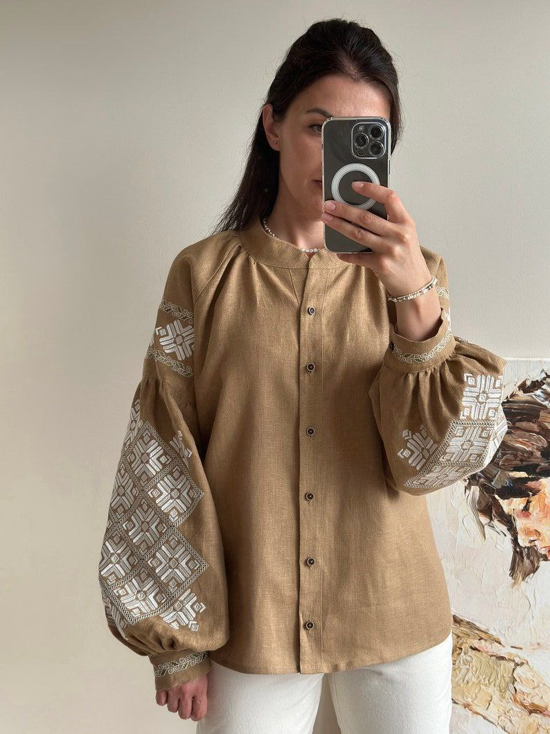 The blouse has a delicate fragile silhouette, it will emphasize all the beauty and hide flaws On a lush embroidered sleeve there are single rhombus.