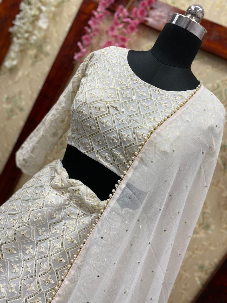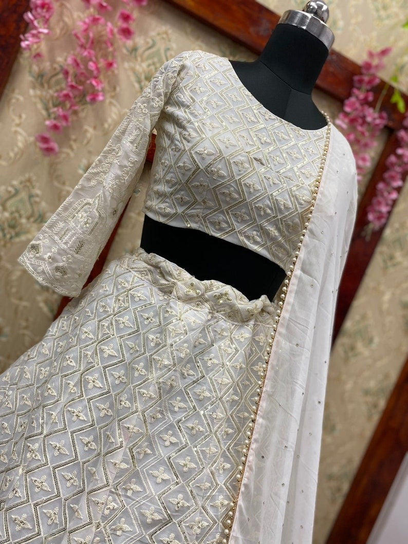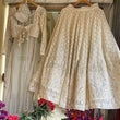 Cream-coloured embroidered lehenga choli with dupatta, thread work