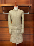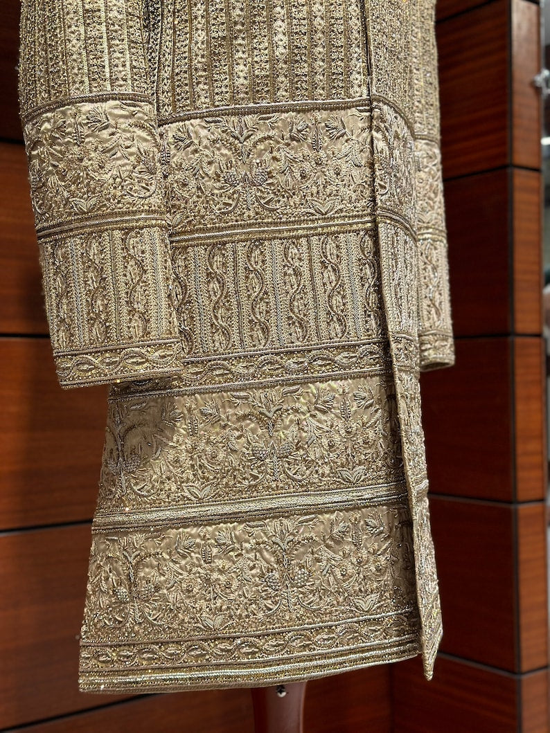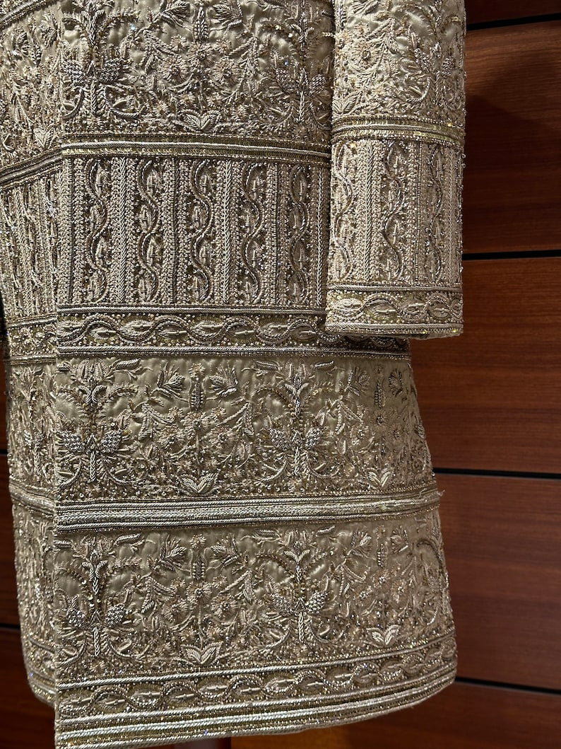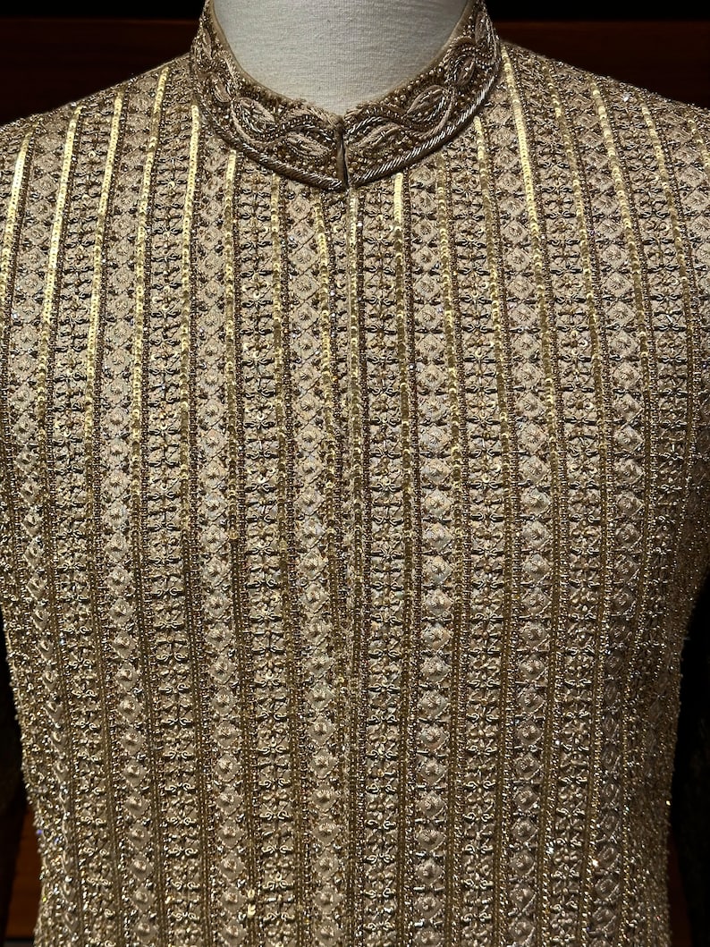 Introducing our regal masterpiece - the heavy Golden Silk Sherwani, a harmonious blend of tradition and modernity. Immerse yourself in the luxurious touch of silk, meticulously crafted in various styles to capture both contemporary and classic allure.