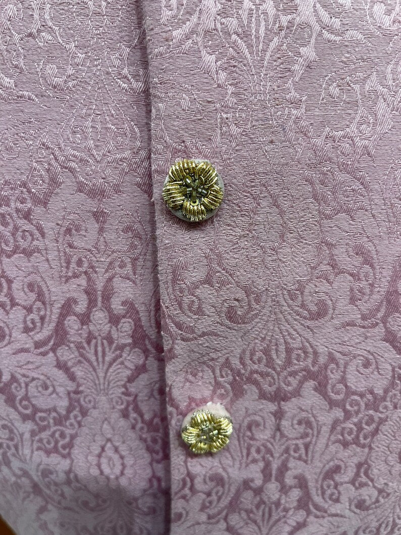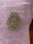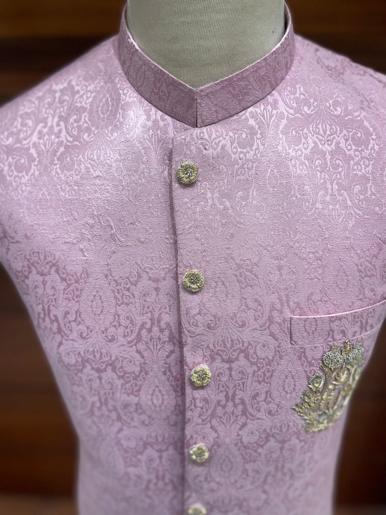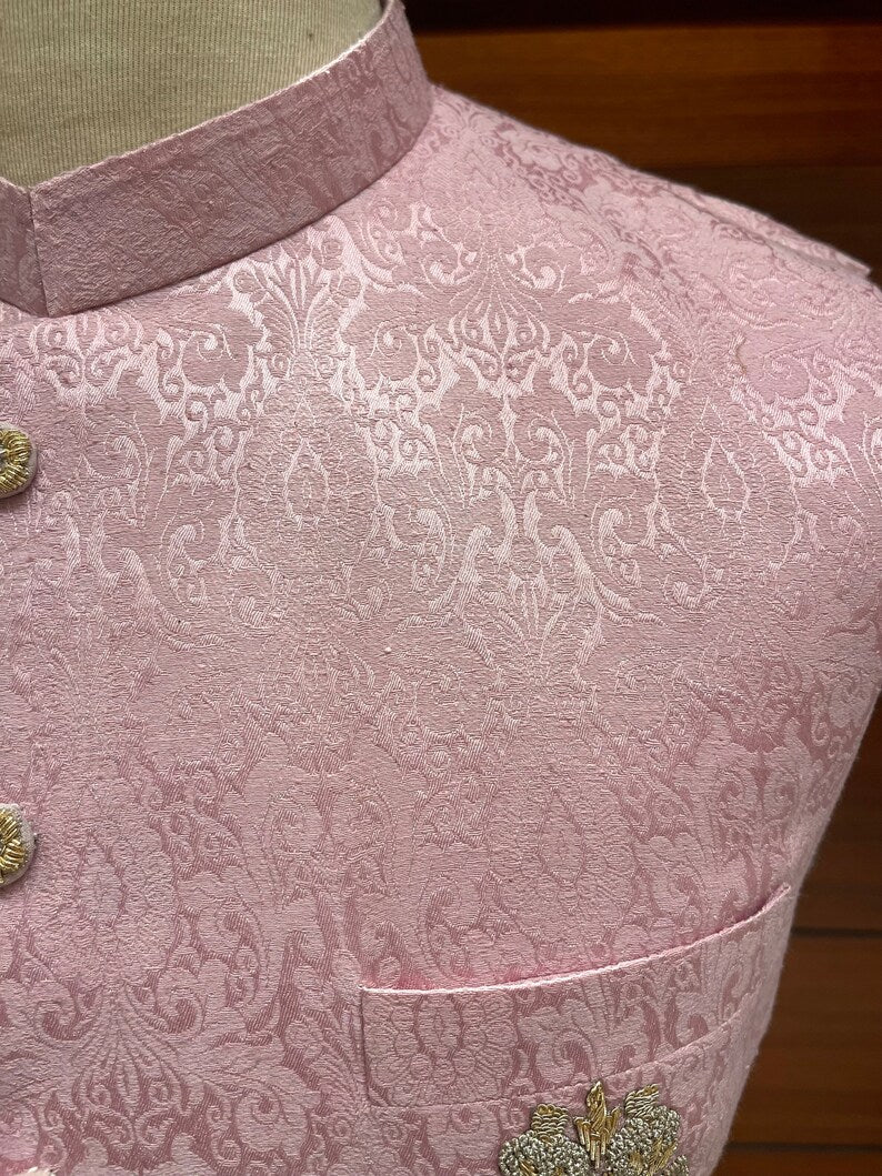 With our custom-made Pink Self Karandi Waistcoat for men, which embodies happiness and celebration, you'll be sure to make a statement at your Mehendi celebration. An elegant waistcoat is set off by a base of self-embroidered karandi adorned with a dainty floral print.
