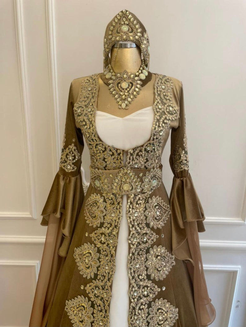 - Velvet kaftan with bindalli is suitable for sizes 36-42 and is sold as a full set. Kaftan inner dress, headdress, belt and necklace are included in the price.