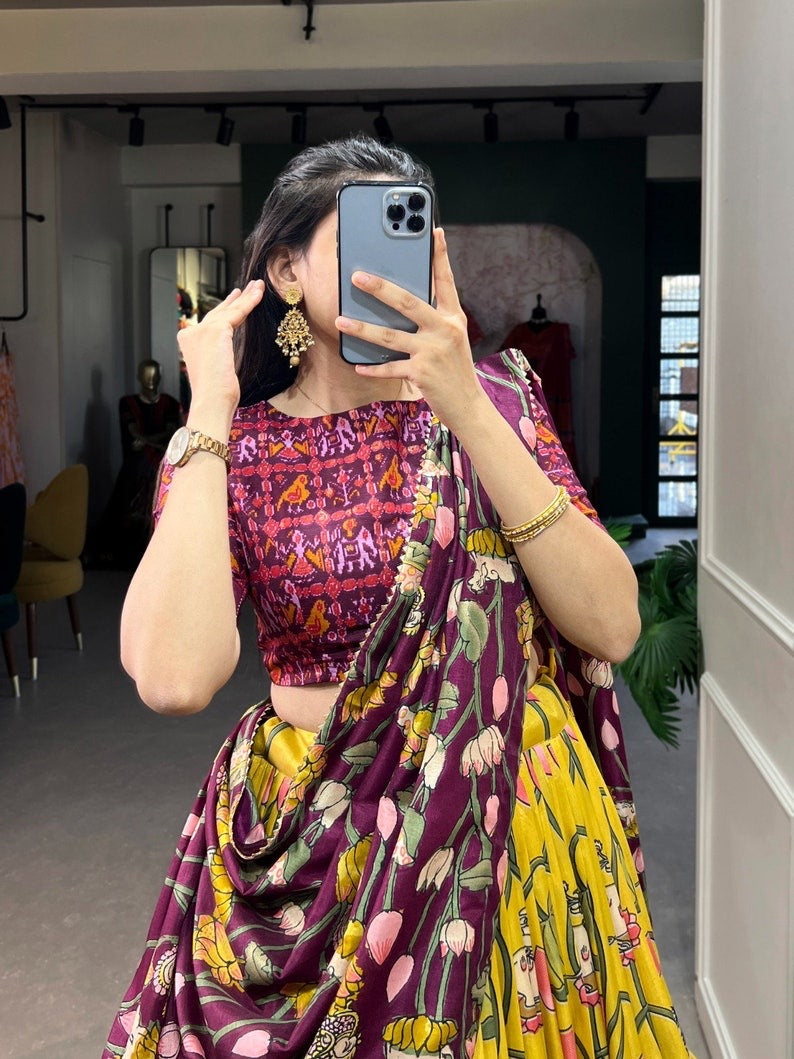 Enhance your wardrobe with our Gorgeous Yellow Patola Print Zari Weaving Border Work Lehenga Choli. Made from Tussar Silk, this lehenga features Pichwai with Patola print and foil work border, offering a stunning look. The blouse, made from Tussar silk with Patola print and foil work, adds a touch of elegance. The Kalamkari print and gotta patti lace border on the Tussar silk dupatta adds a traditional touch. Package includes lehenga, blouse, dupatta, and drawstring with zip.