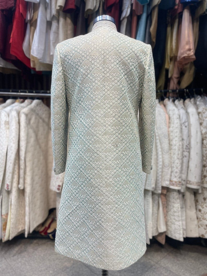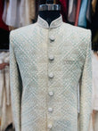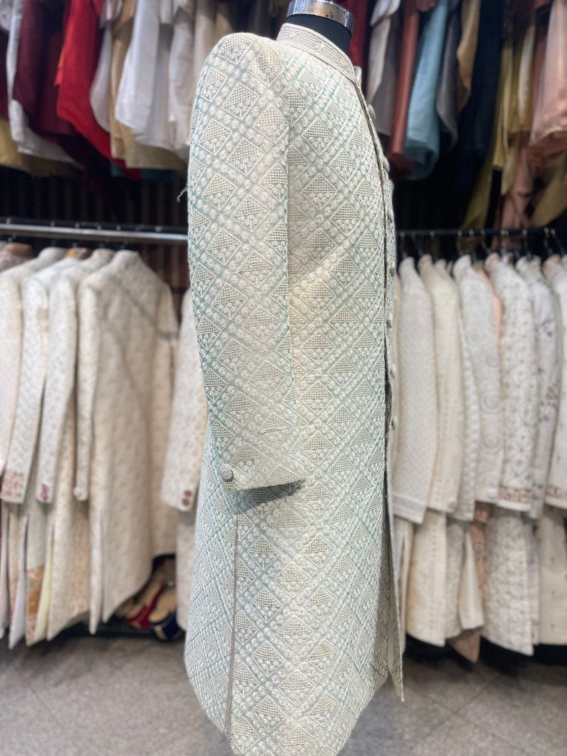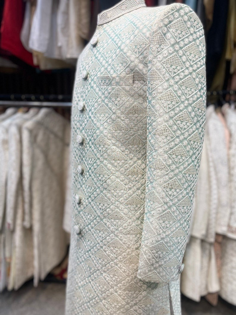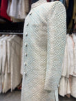 It’s has hand embroidered collar and all over cotton thread work that make sherwani very sober and sophisticated