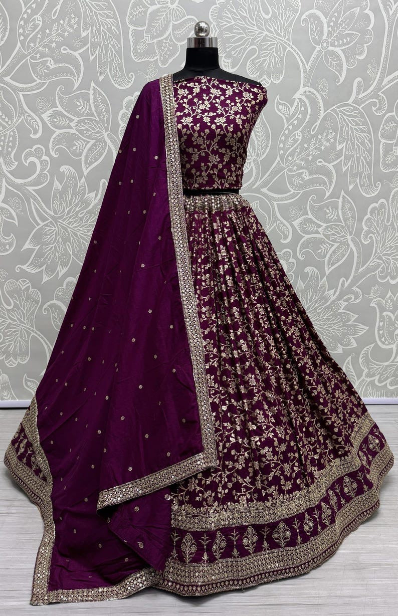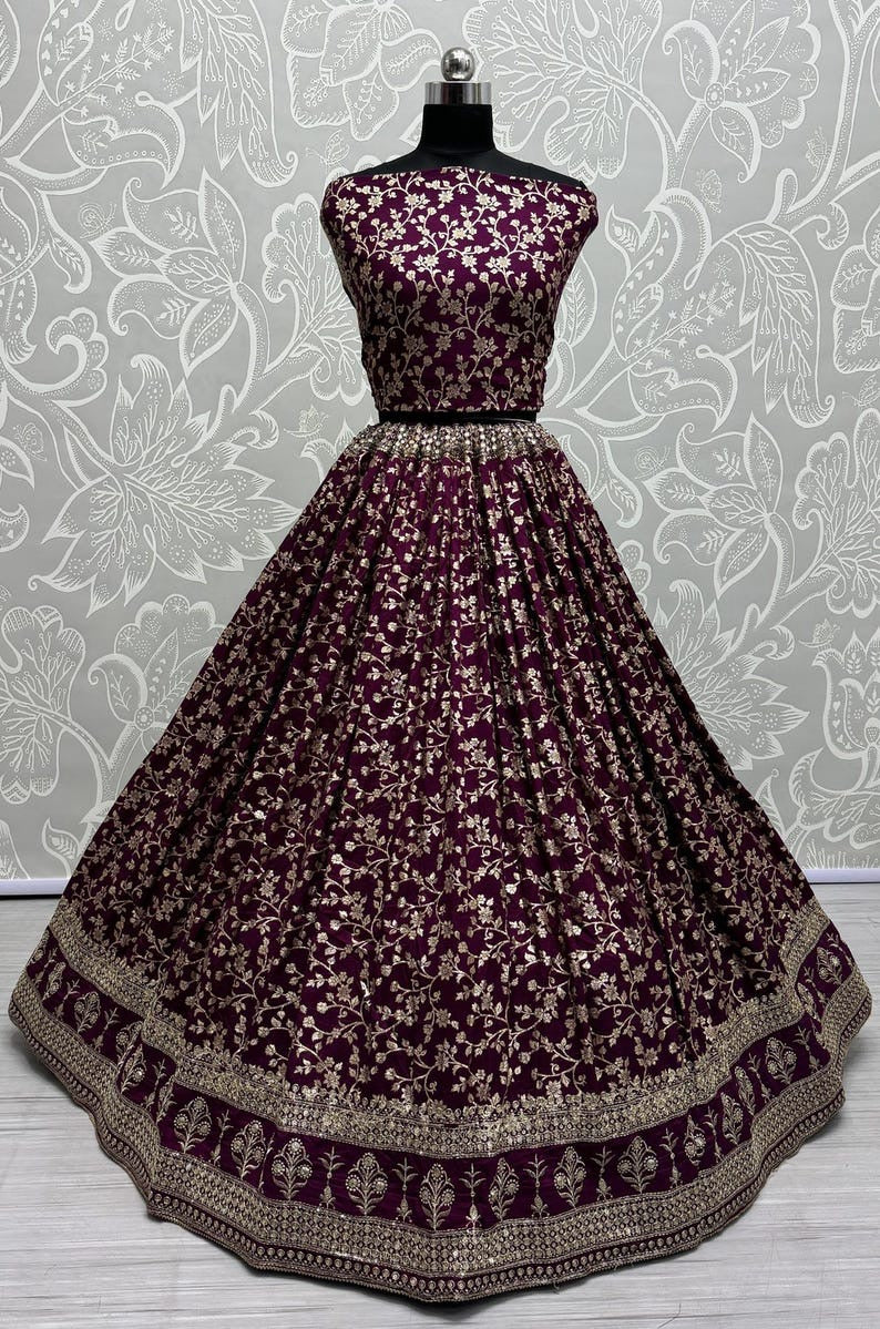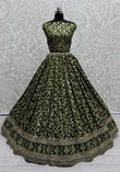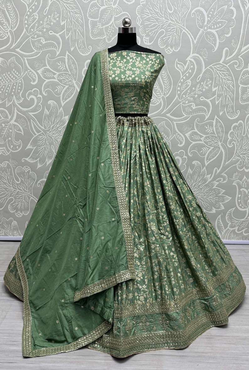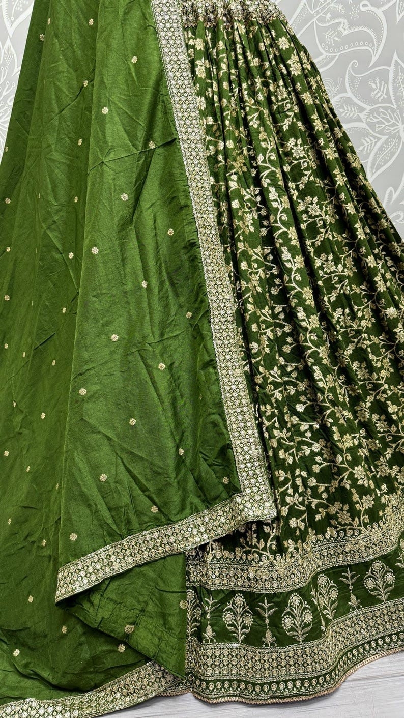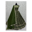 Green and gold-toned embroidered lehenga choli with dupatta, sequinned