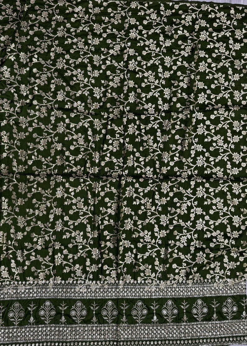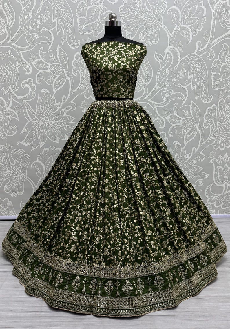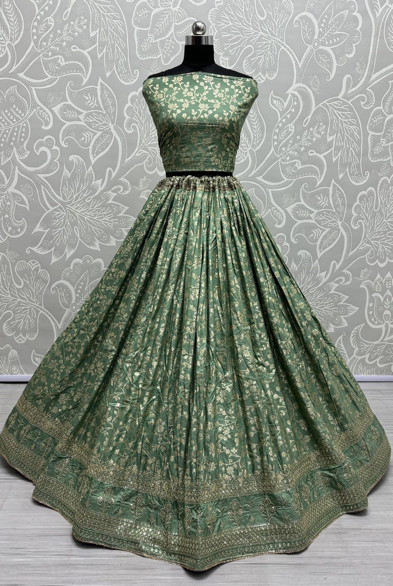 Green and gold-toned embroidered semi-stitched lehenga, flared hem