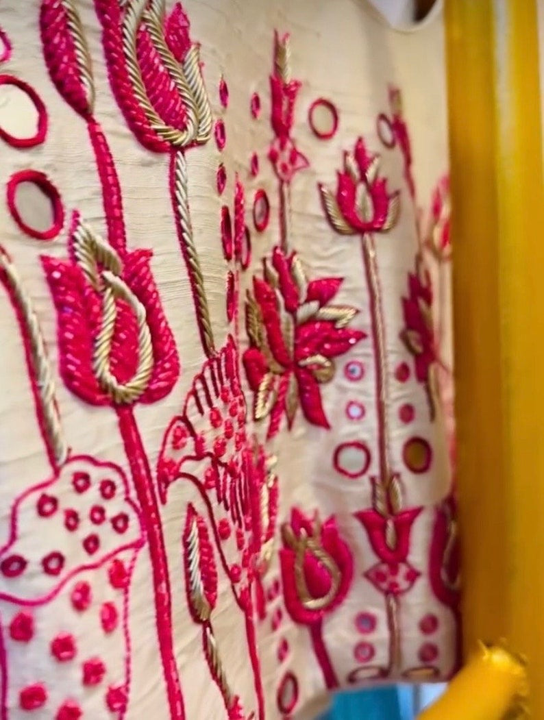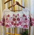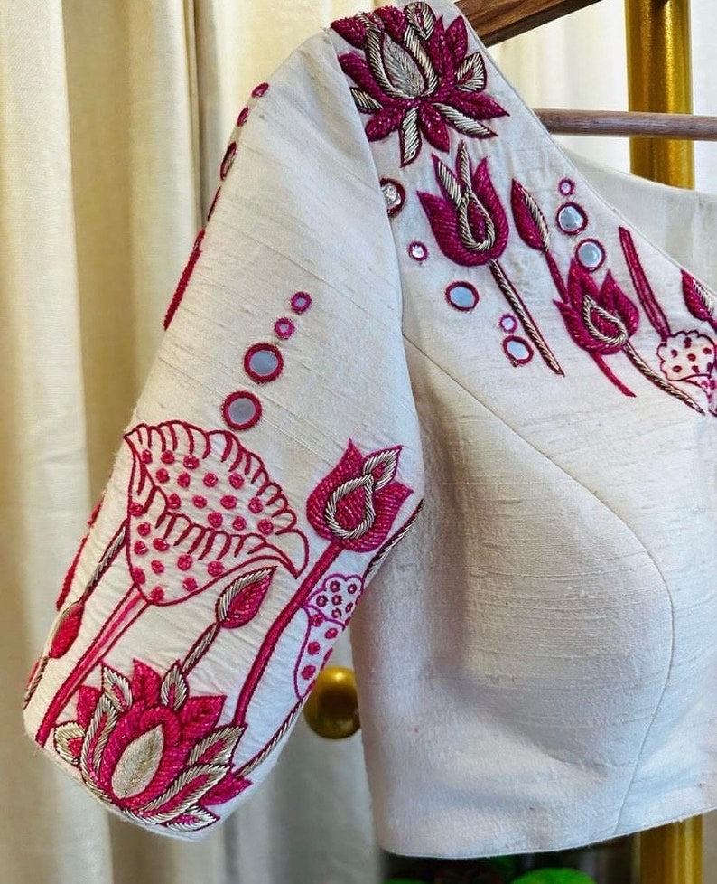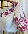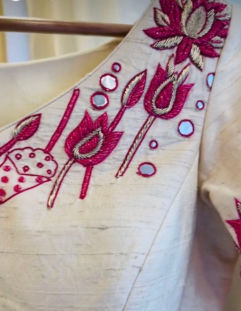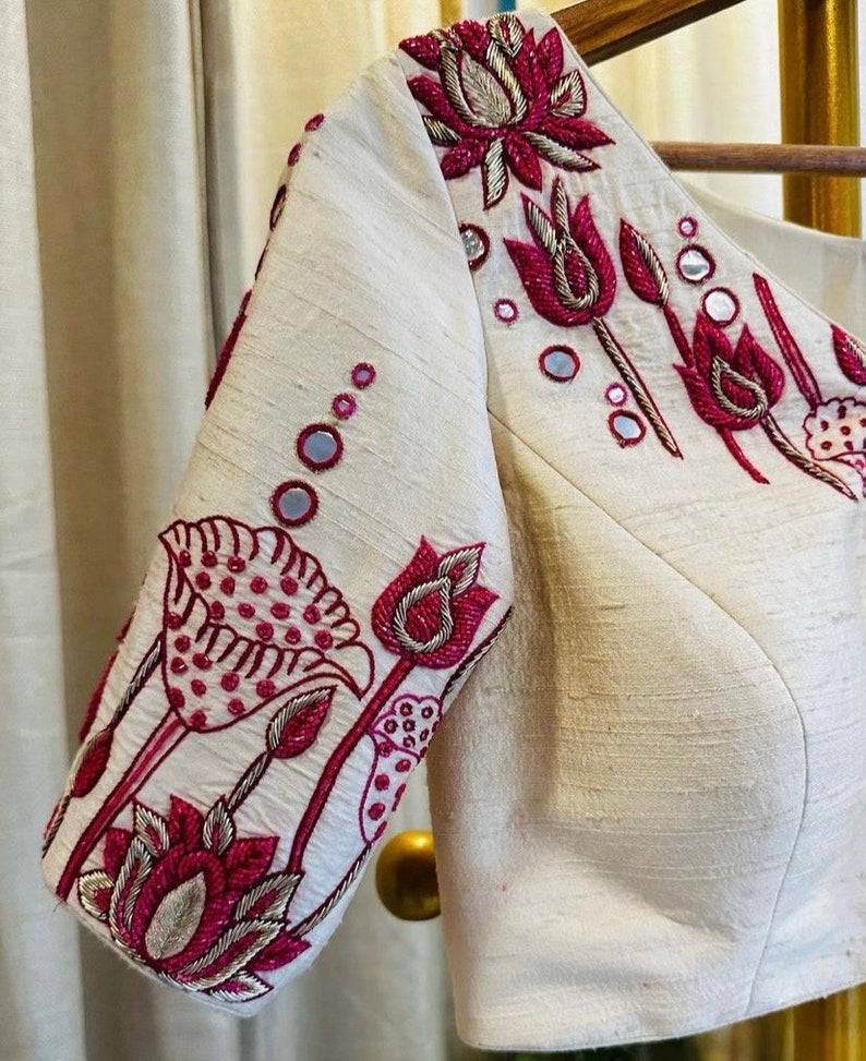 Here is a beautiful Hand embroidered saree blouse/ crop top in cream color that has unique floral motifs hand embroidered on body and sleeves highlighted with burgundy red bead detailing as shown!! Runs with any self or contrast color saree ! Please message us for any color / size customization !!
