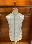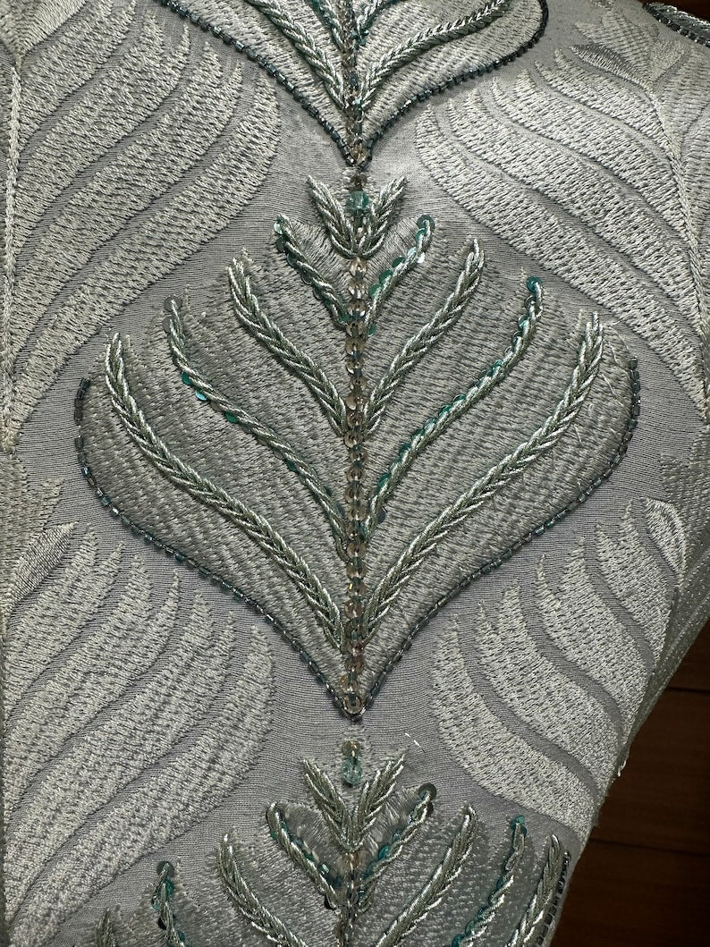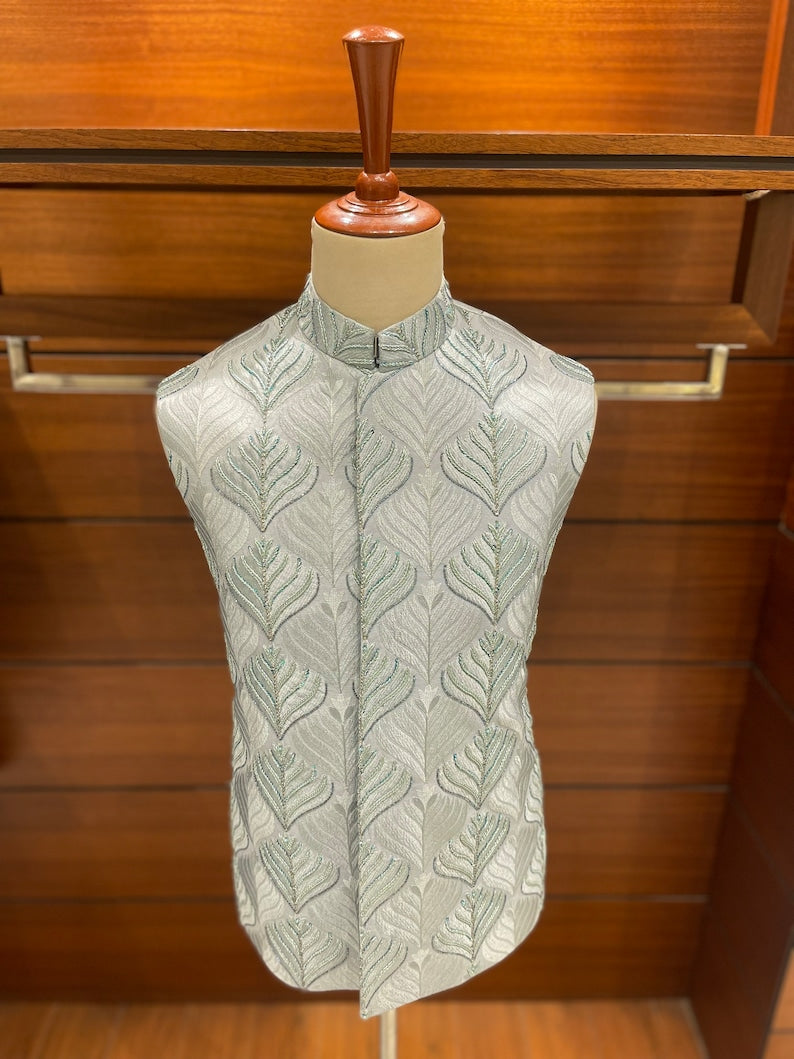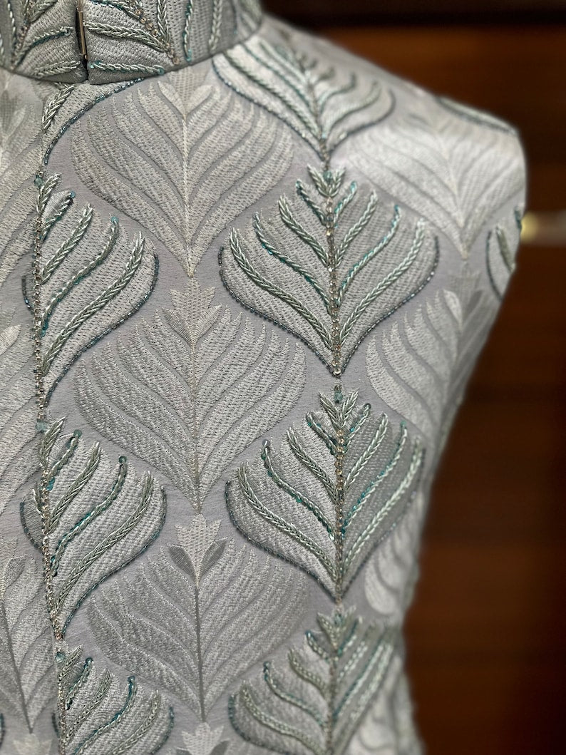 Step into elegance with our Ice Blue Self-Embroidered Karandi Waistcoat for men – a rare and exquisite piece tailored for the groom on his special day. The karandi base, adorned with a delicate floral print, boasts a colour so unique it's seldom found. Hand-stitched zardozi work enhances the floral elegance, with a carefully chosen color scheme to complement the enchanting blue hue.