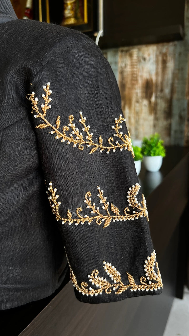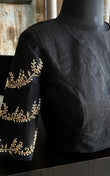 1. This exquisite black embroidered blouse features intricate gold embroidery, adding a touch of elegance and sophistication to any outfit.