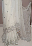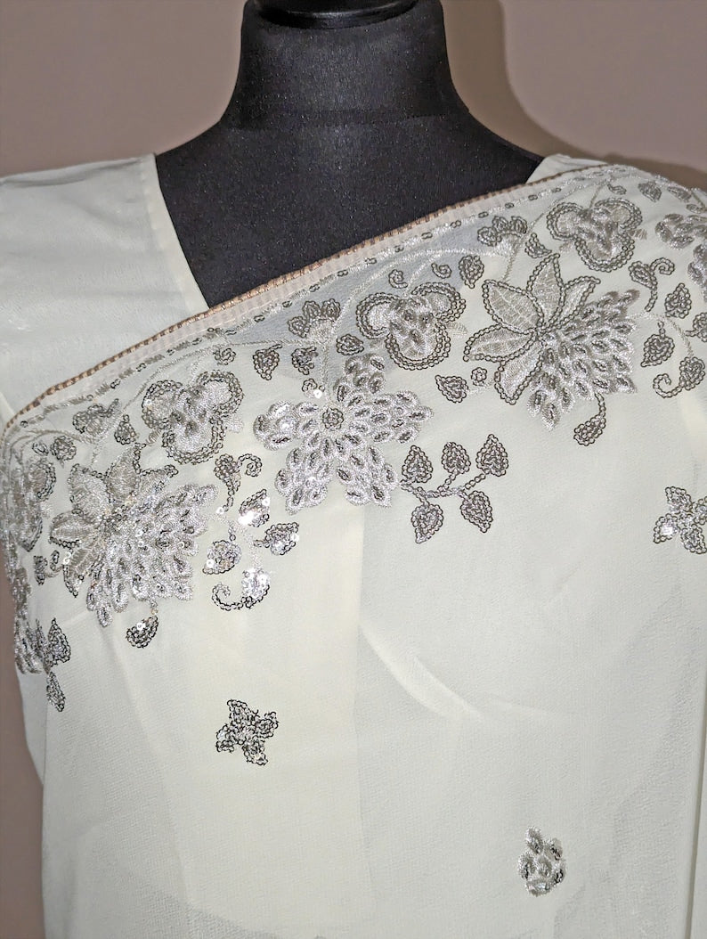 Presenting this beautiful ivory white handwork sequin, silver metallic thread work faux georgette saree. Suitable for party wear, Wedding wear designer soft saree on premium fabric with all over work.