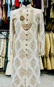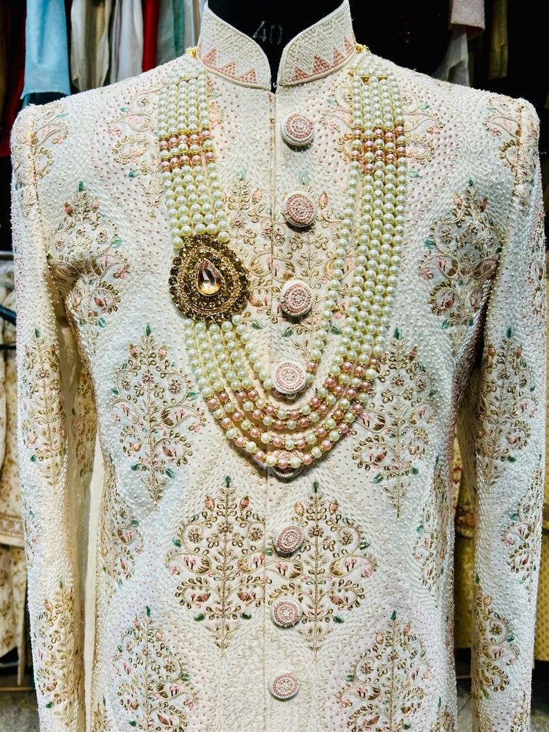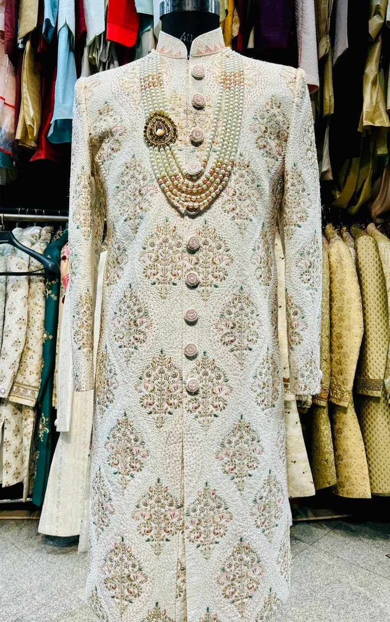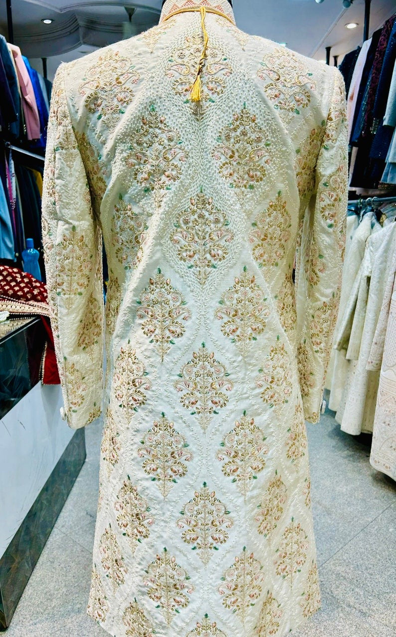 Ivory Hand Embroidered Pink and Pista Touch Men Sherwani
