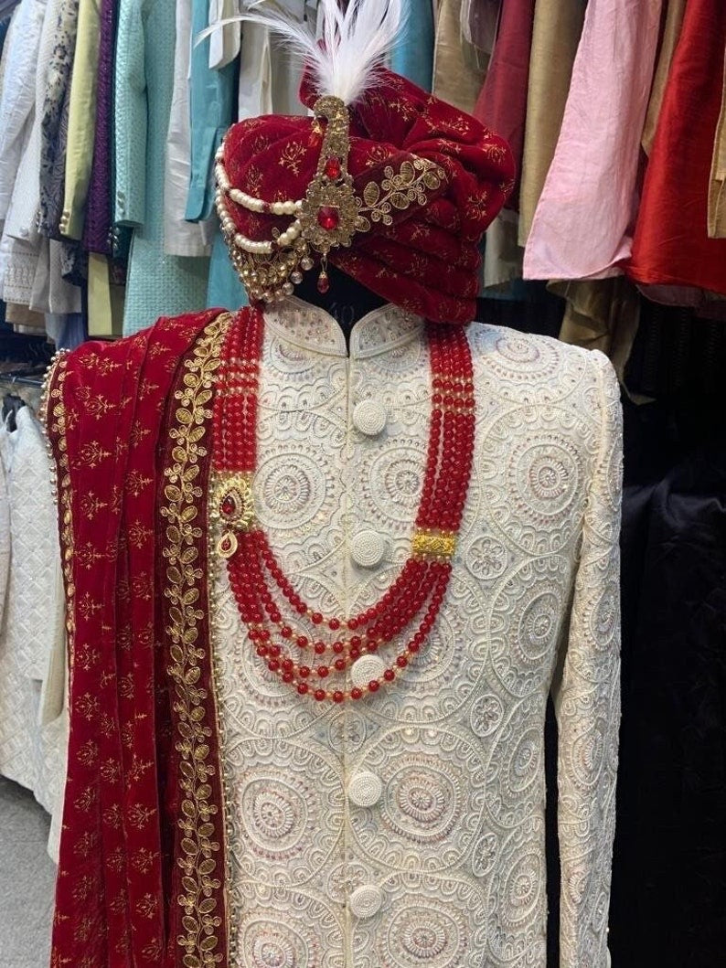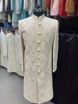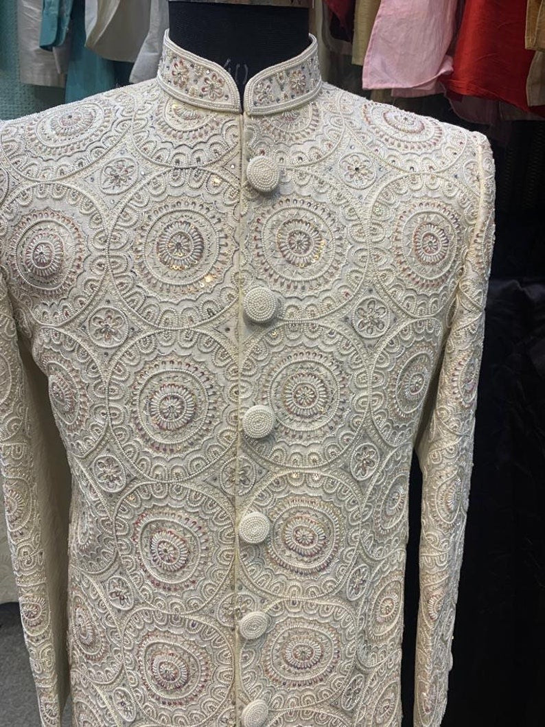 Sherwani has mandarin collar and long sleeves with a full button placket asymmetric hem and multiple slits
