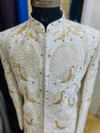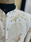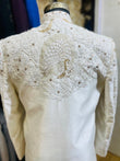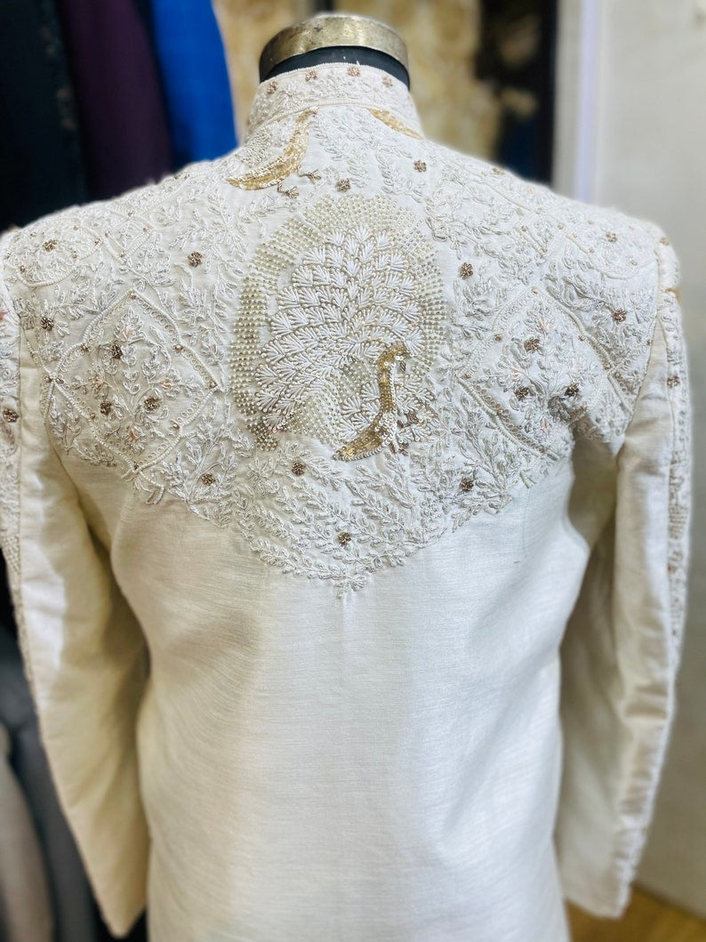 It’s have a beautiful designed embroidery work all over the sherwani it’s made of resham thread and zardosi peacock shaped heavy work motifs with the blend of zari and thread work