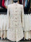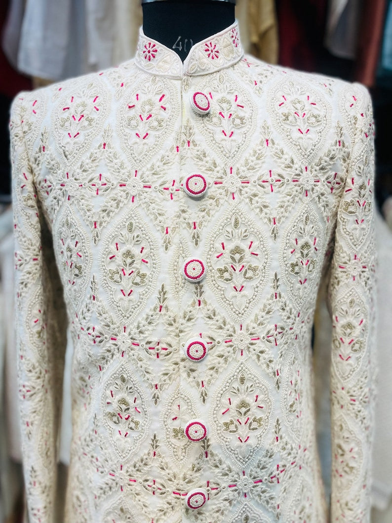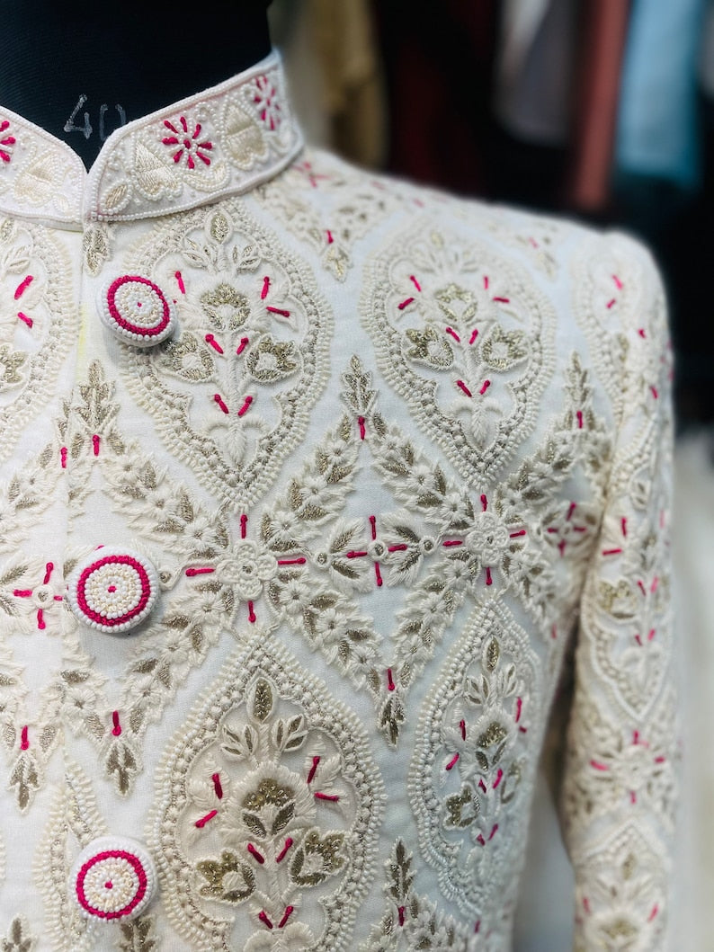 Ivory Magenta Heavy Hand Embroidered Groom Sherwani