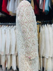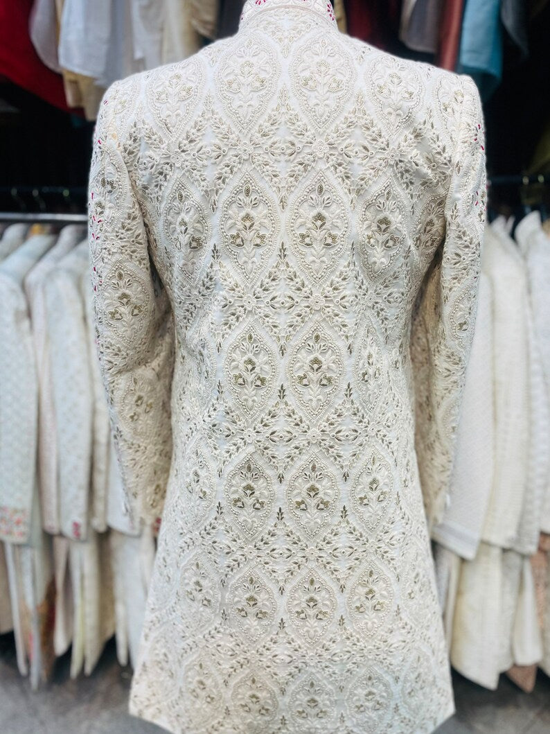 All over work over the sherwani is a mix of hand work zardosi and thread work which is highlighting the cotton thread motifs and the highlighting is done with glass beads and resham thread