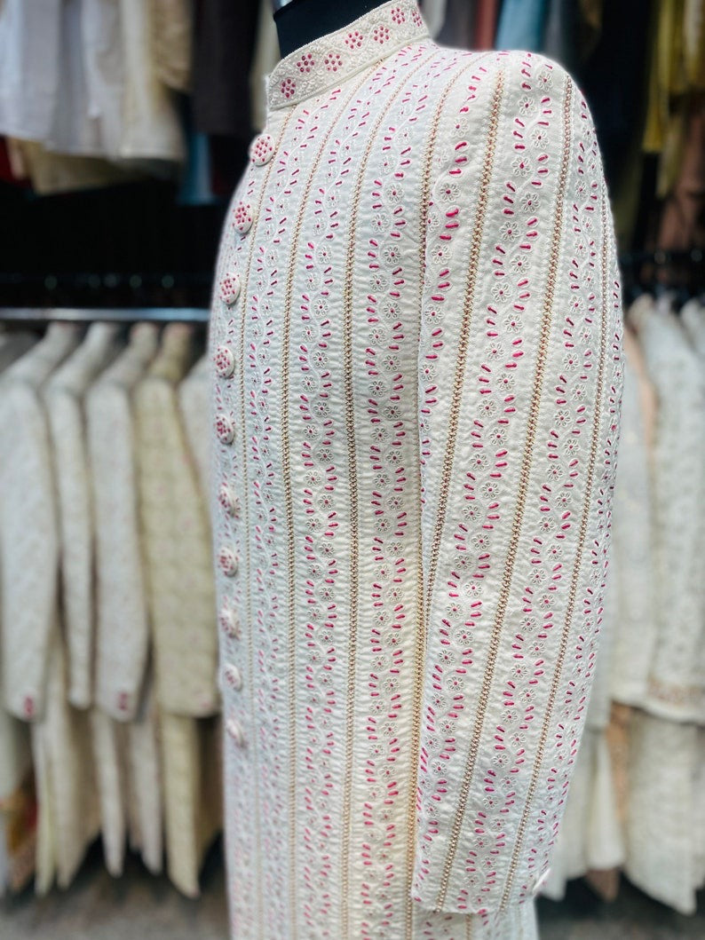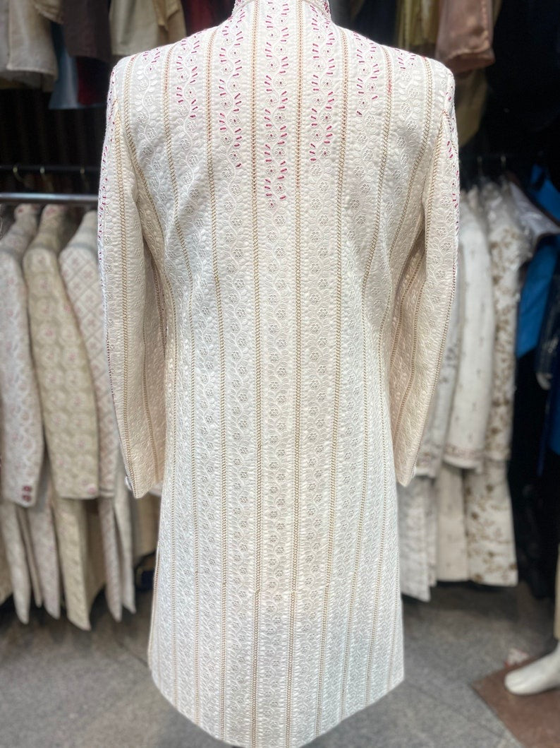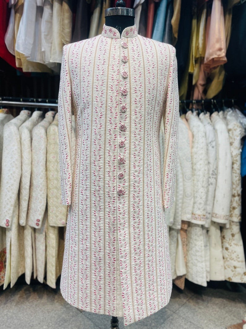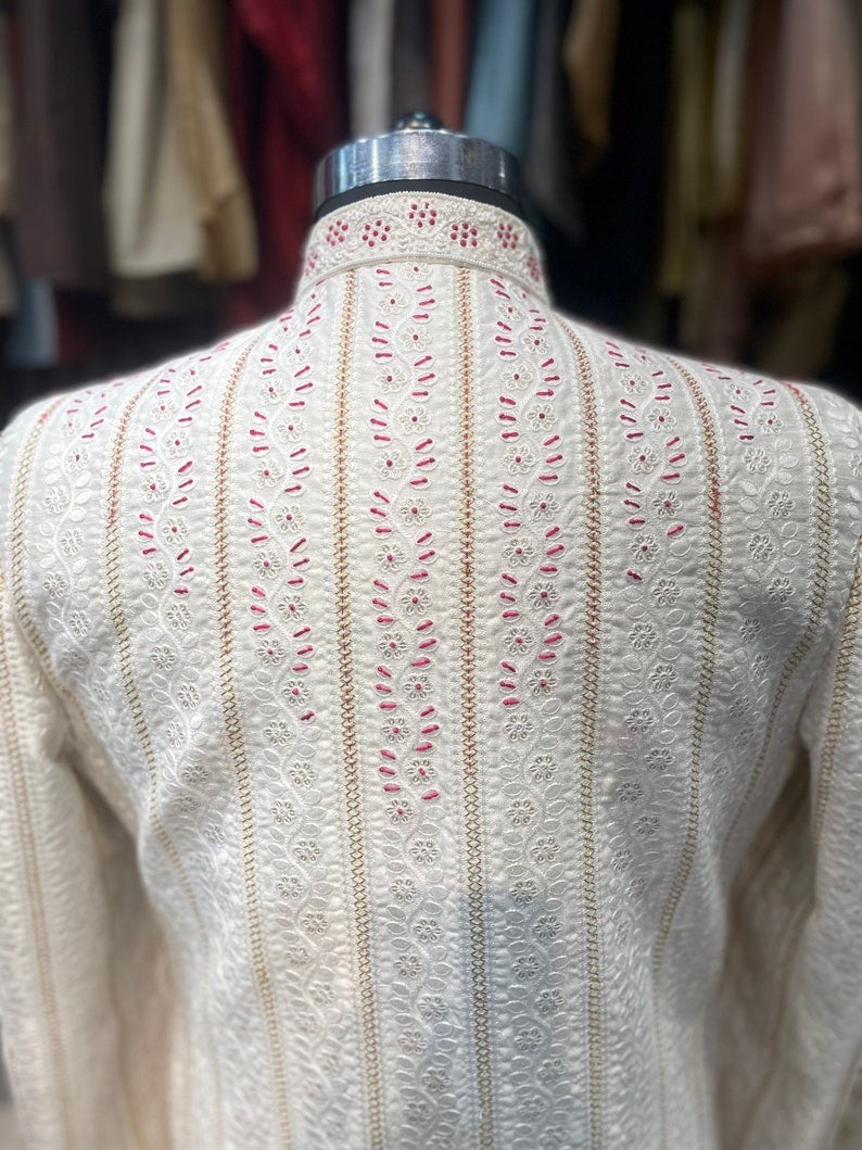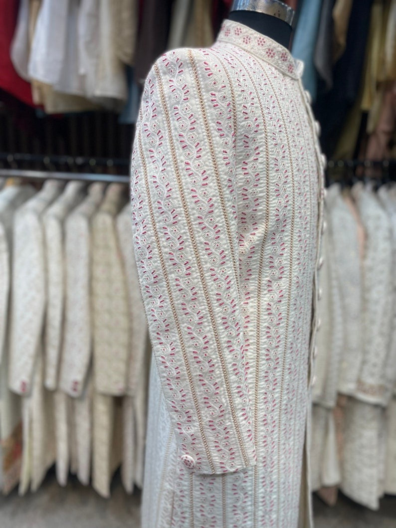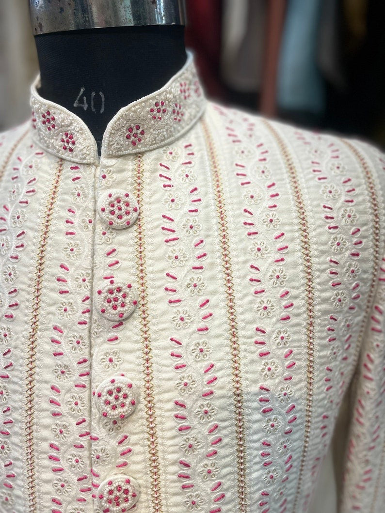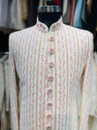 Ivory Magenta Thread Work Embroidered Groom Sherwani
