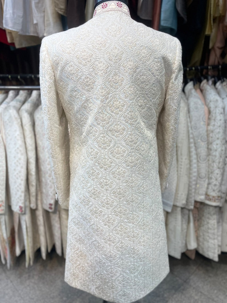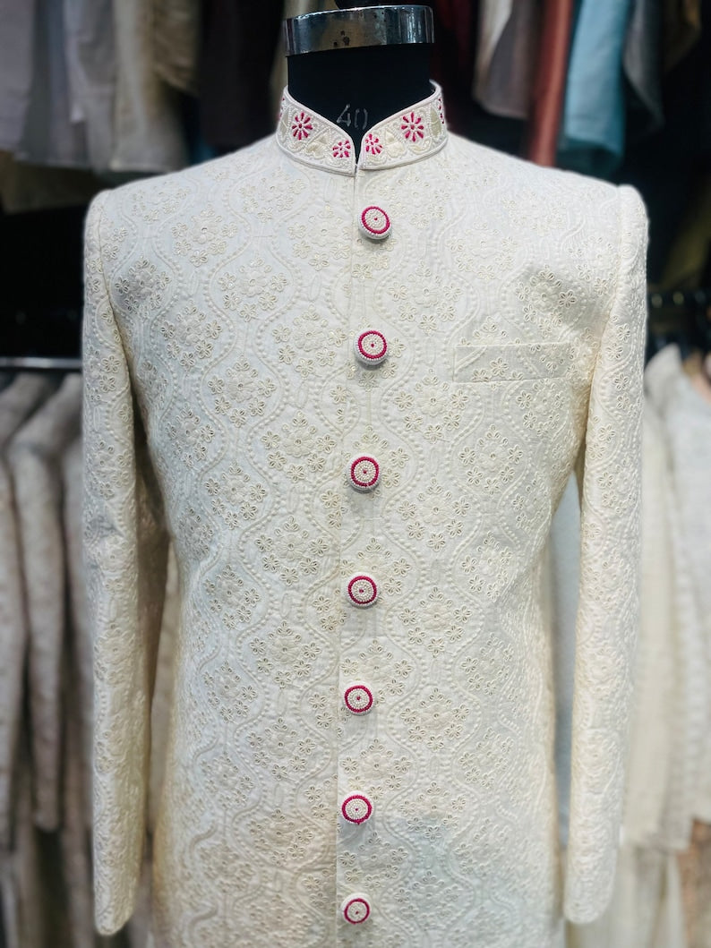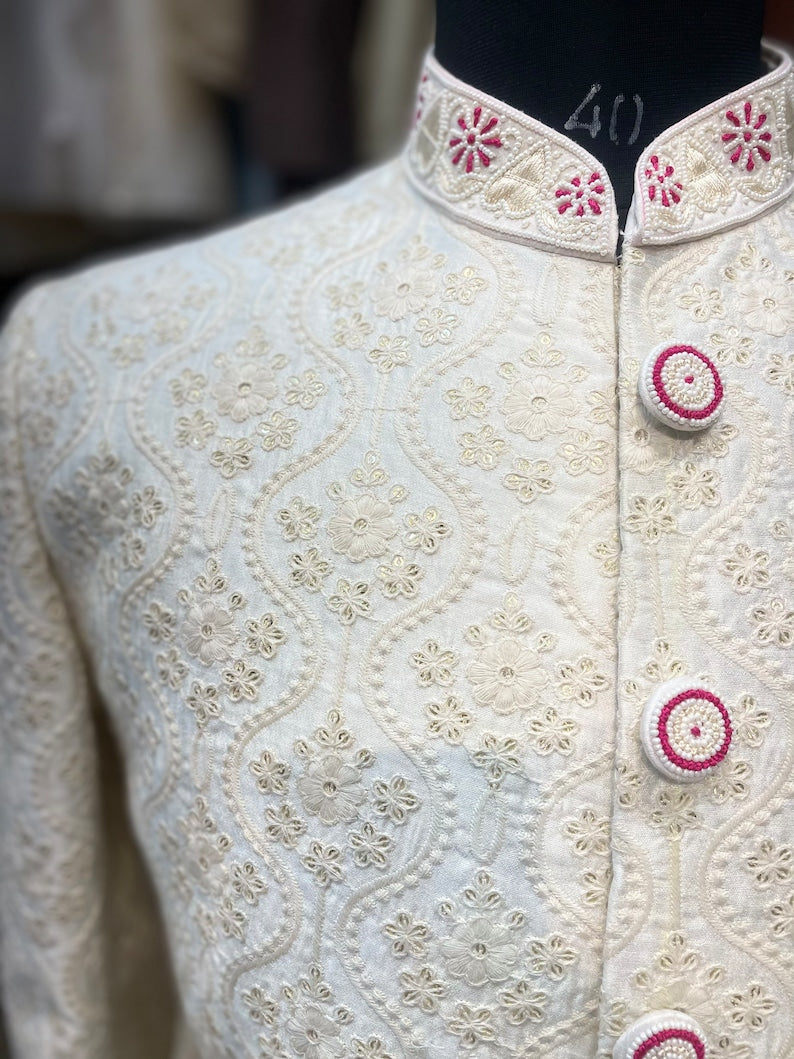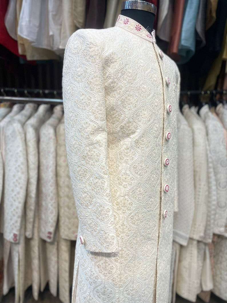 All over work over the sherwani is done with cotton thread and minor sequences highlighting make the entire piece sober and sophisticated