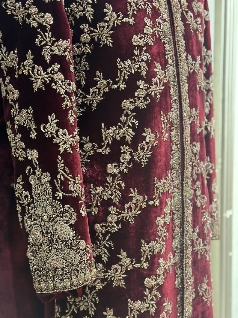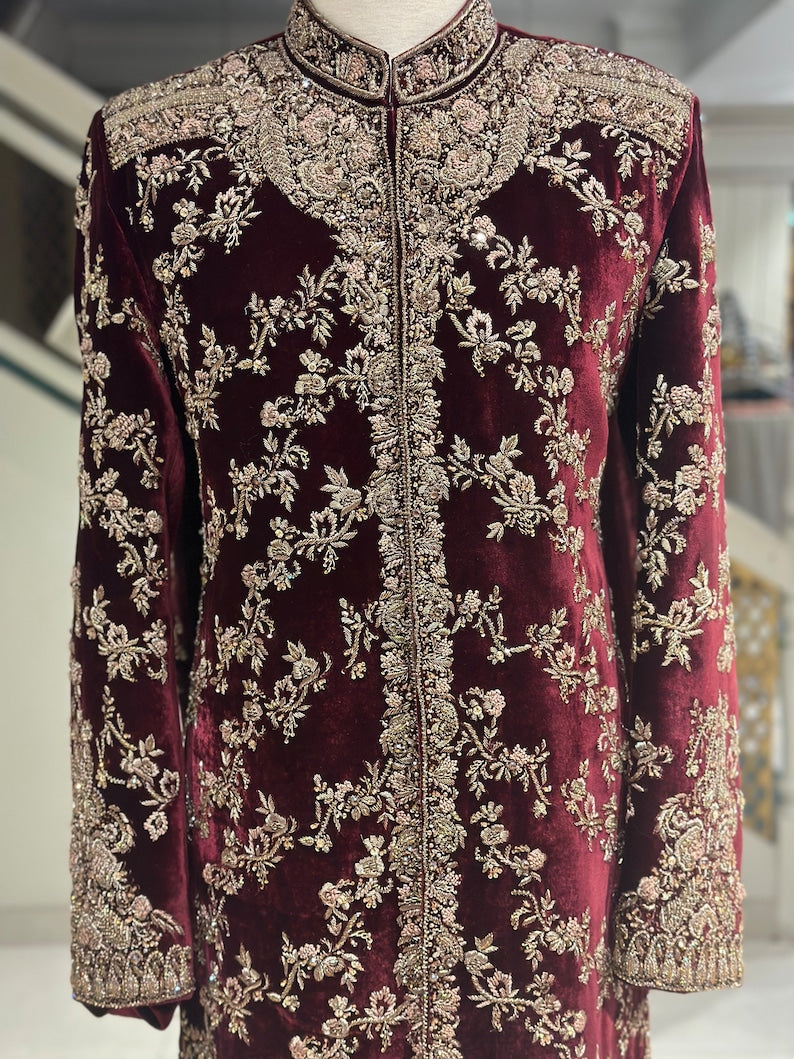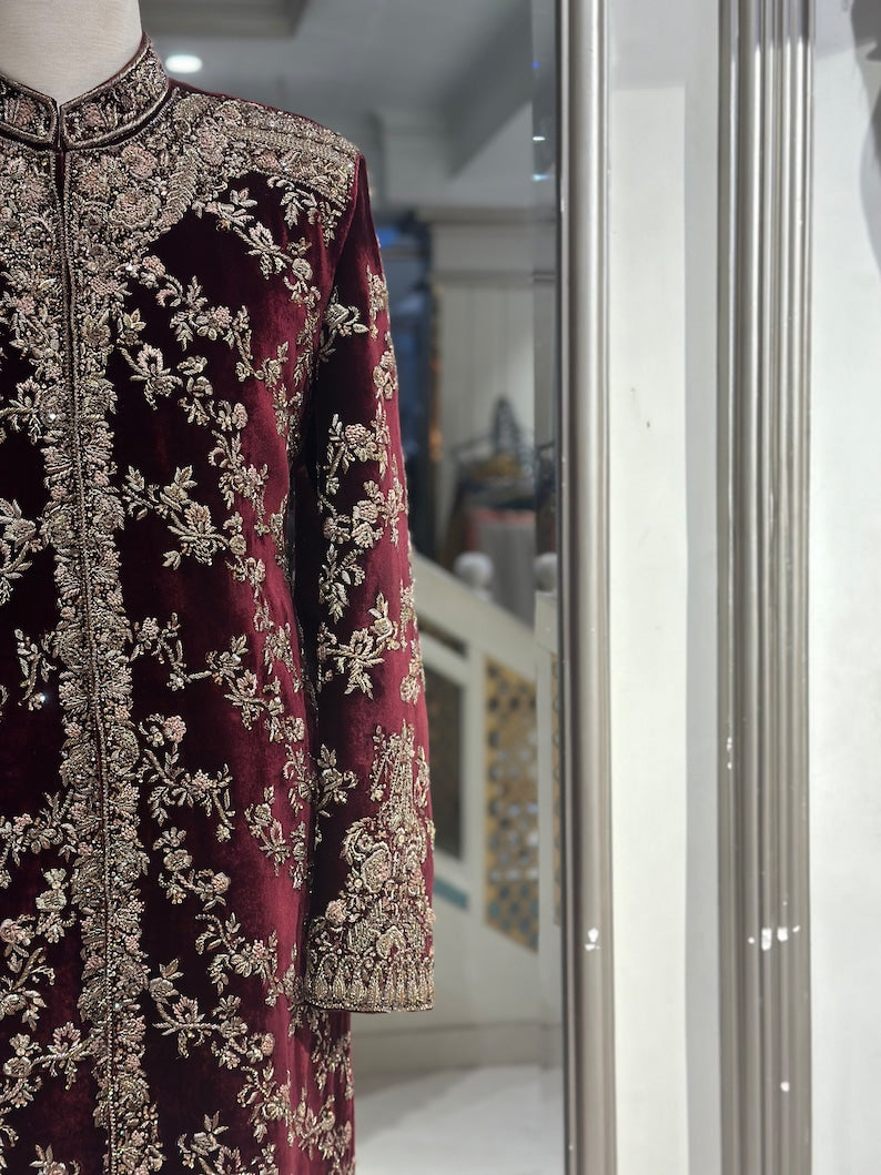 Stunning Pure Shaffon Silk Velvet Groom's Masterpiece: An opulent maroon velvet sherwani.