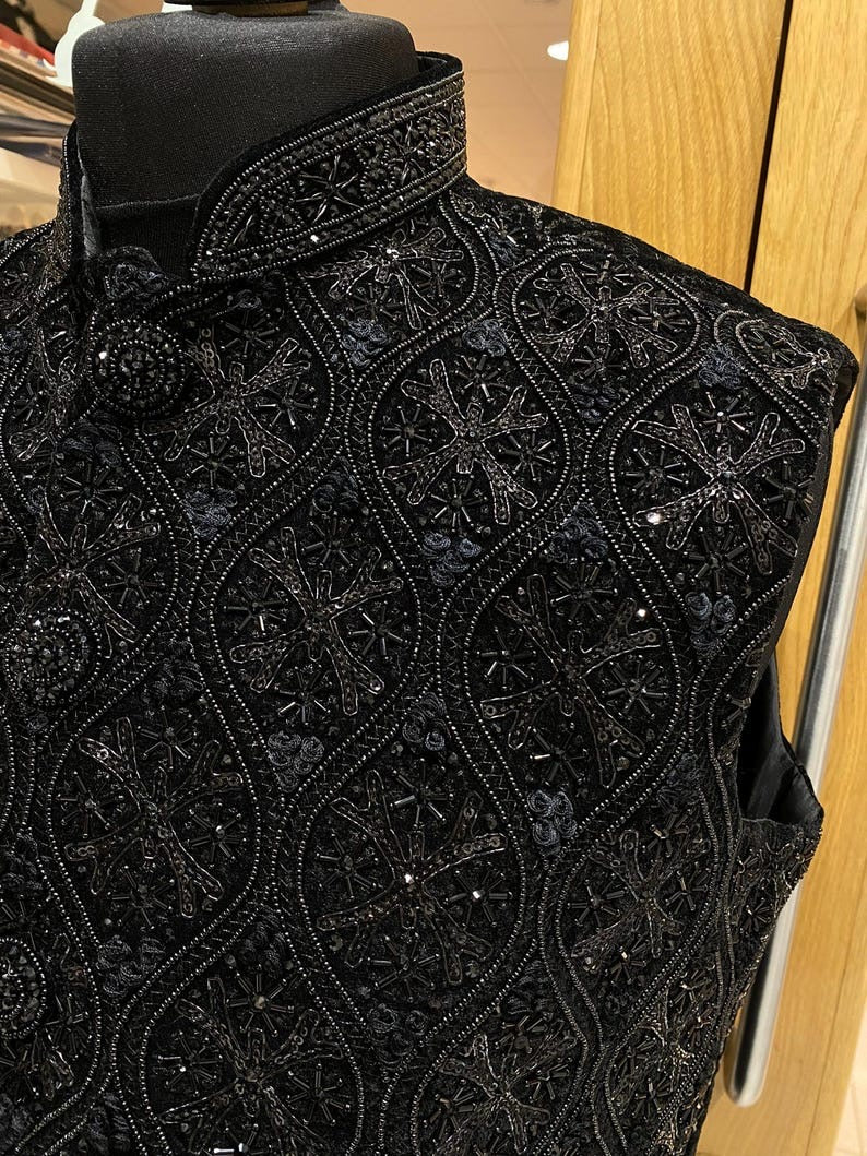 Introducing our Black Hand Embroidery & French Knot Threadwork Waistcoat – a meticulously handcrafted piece that seamlessly blends traditional Indian craftsmanship with contemporary style. This waistcoat is a timeless addition to your wardrobe, showcasing an elegant black hue that exudes sophistication and versatility.