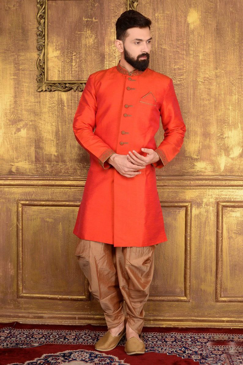 Product Description : Fabric: Silk Blend | Contents: A Set Of Ang Rakha Style Indo western Sherwani In Jute Blend Fabric With Cowl Dhoti rich Silk Fabric Indo-Western Style Sherwani In Angrakha Pattern Ornamented With Rich Metal Buttons. A Sleek Smart Not Too Goody, Simple Yet Elegant, Light Weighted Comfortable Savior For All Occasion. Set Contains A Latest Design Soft Comfortable Feel Cowl Pattern Patiala Style Dhoti Pant. All Our Sherwanis Have Four Inches Loosening Over The Body Measurement. So If Your Chest Round Measurement Is 38 Inches Then You Should Go For A 38 (Medium) Size Kurta Which Will Have A Garment Ready Chest Measurement Of 42 Inches. We Offer Six Sizes - Small = 36 (Chest - 40), Medium = 38 (Chest - 42), Large = 40 (Chest - 44), X- Large = 42 (Chest - 46), XX - Large = 44 (Chest - 48) And XX - Large = 46 (Chest - 50).Vastramay Introduces To You These Classy Sherwani For Men Stylish Latest Design In Variety Of Material And Designs For All Occasions. This Men's Ethnic Wear Fabric Has Been Designed Keeping In Mind The Latest Trends In A Semi Formal Fashion Or Occasional Fashion. Engineering Garments Which Fit All Body Types And Style Is Our Aim. We Offer Not Just Sarvani For Man For Wedding But Also Indo Western For Men And Semi Sherwani As Well Covering The Entire Space. Our Sarvani Are Constructed In Such A Way That You Can Adorn It With A Churidar, Dhoti For Men Or A Patiala Too. To Complete The Look Adorn A Mojari Or Jutti Slippers For Men Stylish, You May Also Try An Authentic Kohlapuri Chappal For Men, The Fashionistas And Millennial Folks May Experiment With A Brogues Or Oxfords Juta For Men Stylish. Suitable For: Party, Weddings, Sangeet, Mehandi, Regular Wear, Celebrations, Occasions, Festivals, Lori, Pongal, Makar Sankranti, Baisakhi, Saraswati Puja, Holi, Ugadi, Jamai Sasthi, Eid, Raksha Bandhan, Dussehra, Diwali, Navratri, Pooja, Christmas, Onam, Ganesh Chaturthi, Janmashtami And Gifts For Men. Suitable For: Party, Weddings, Regular Wear, Celebrations, Occasions, Festivals, Lori, Pongal, Makar Sankranti, Baisakhi, Holi, Eid, Raksha Bandhan, Dussehra, Diwali, Navratri, Pooja, Christmas, Onam, Ganesh Chaturthi, Janmashtami And Gifts For Mens.Wash Care Instructions: Dry Clean Preferably Or Cold Light : We Have Made A Consistent Effort To Make The Colors And Finishes Similar To The Image Of The Products You See On Screen. However, The Actual Product And The Images On The Website Can Differ! Customer's Discretion Is Advised.