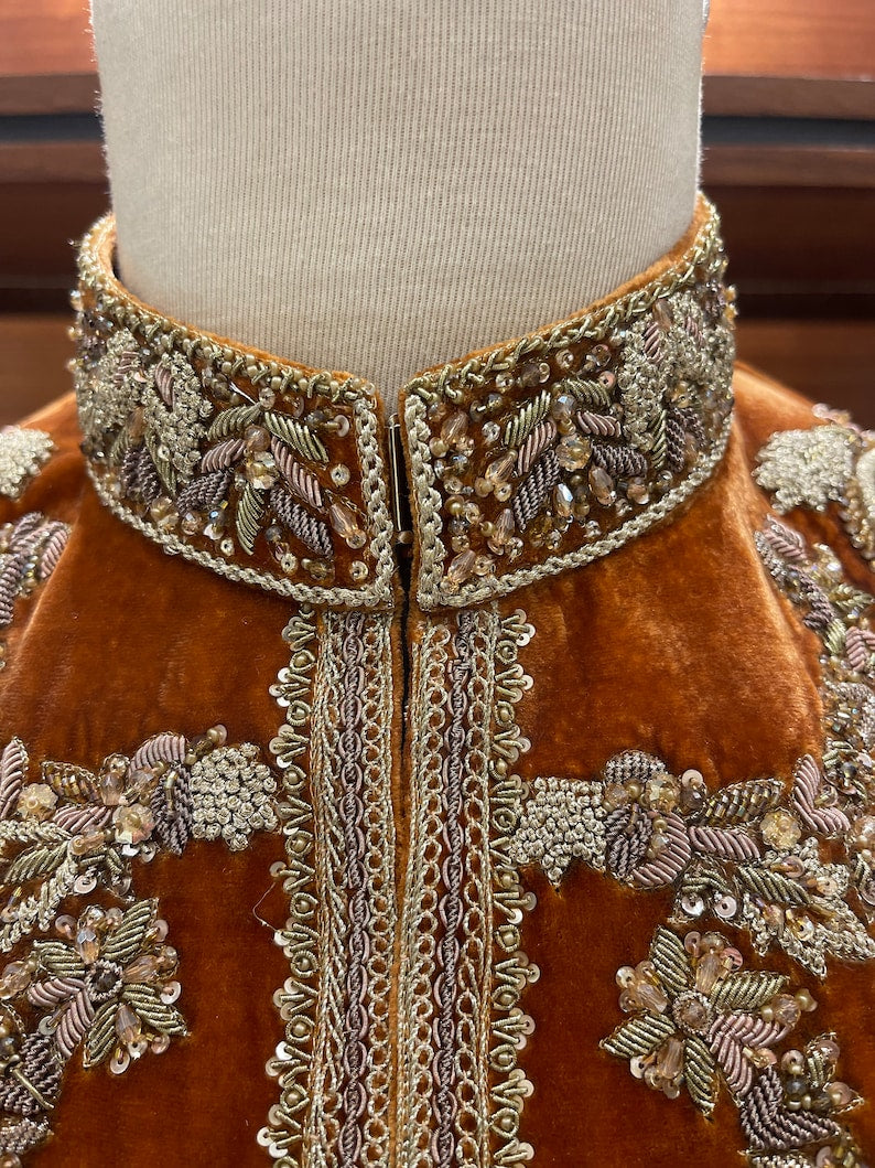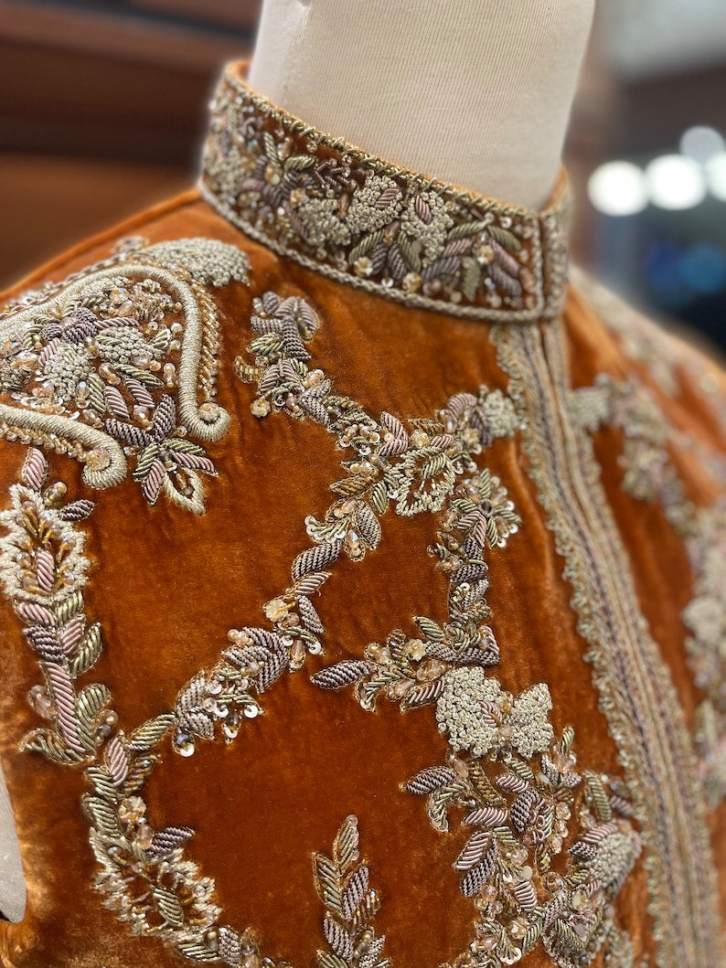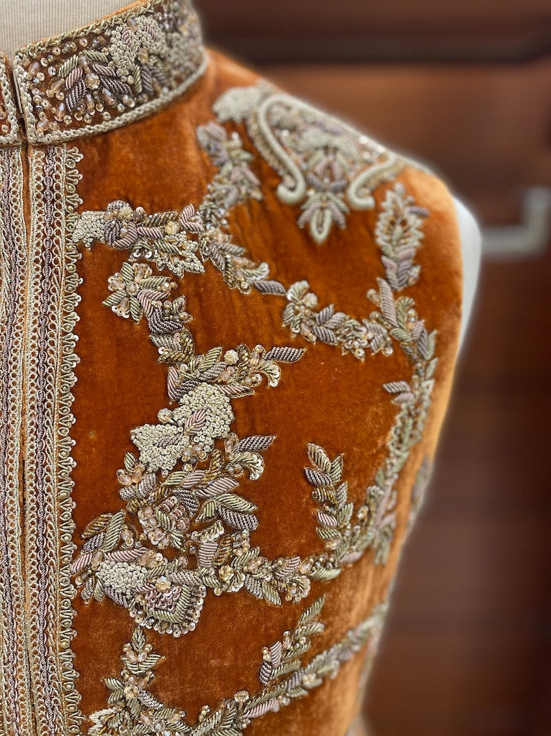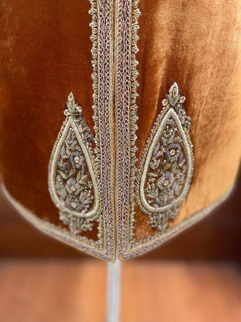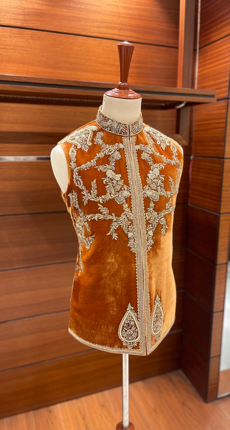 This mustard velvet waistcoat is a masterpiece made just for you. Step into luxury with it on your special day. This unique and magnificent piece, which is made of pure chiffon velvet, has hand-stitched zardozi work that adds a touch of elegance.