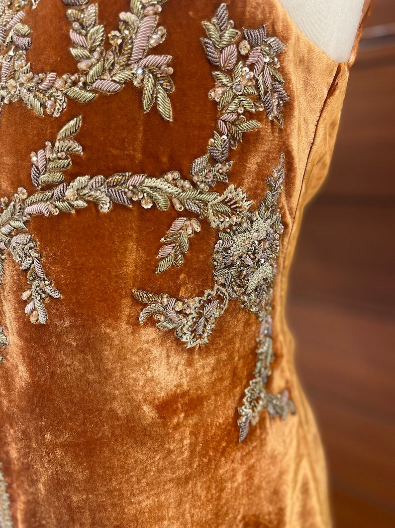 The vivid mustard hue makes a striking visual impact and is ideal for Mehendi celebrations. This outfit is a one-of-a-kind and uncommon find because the premium velvet used in it is among the best available. A hint of opulence is added by the hand-stitched zardozi work, which is creatively scattered throughout the waistcoat and features elaborate motifs at the bottom.