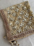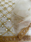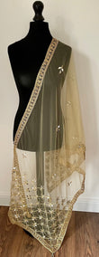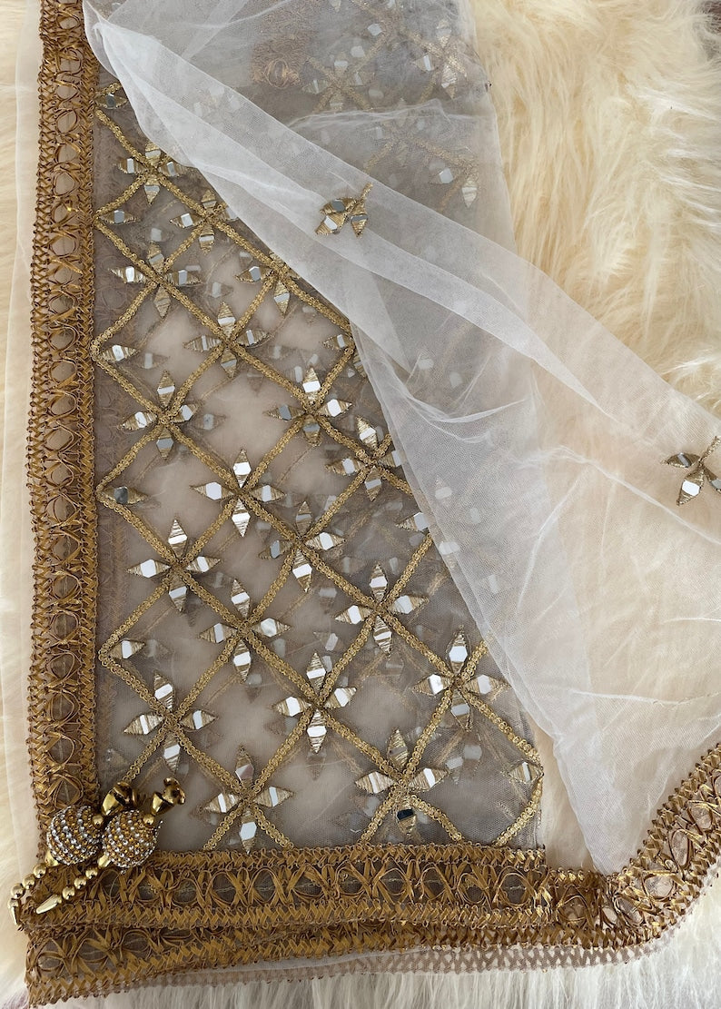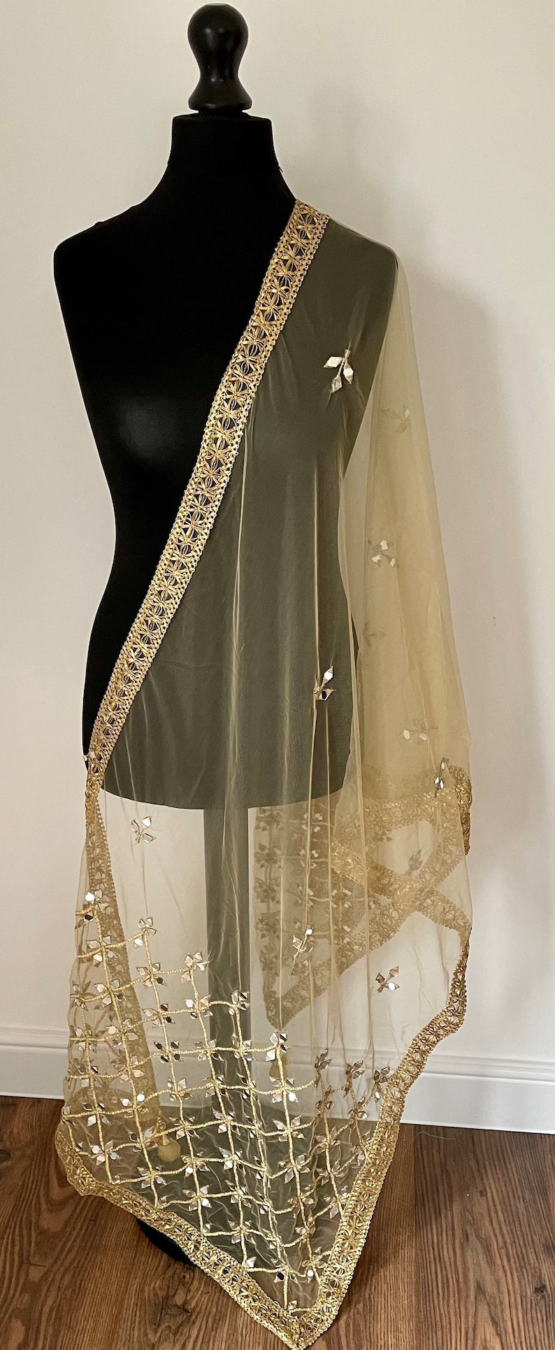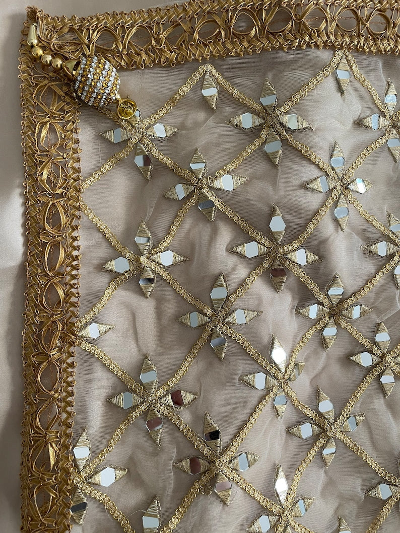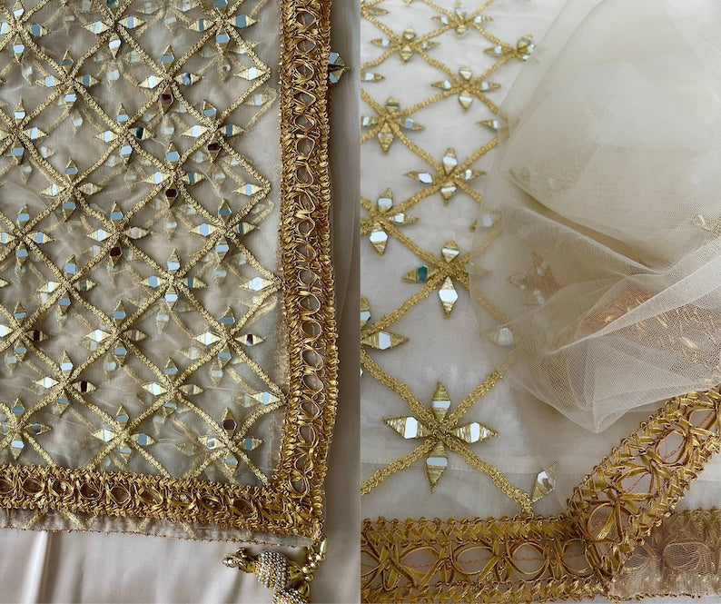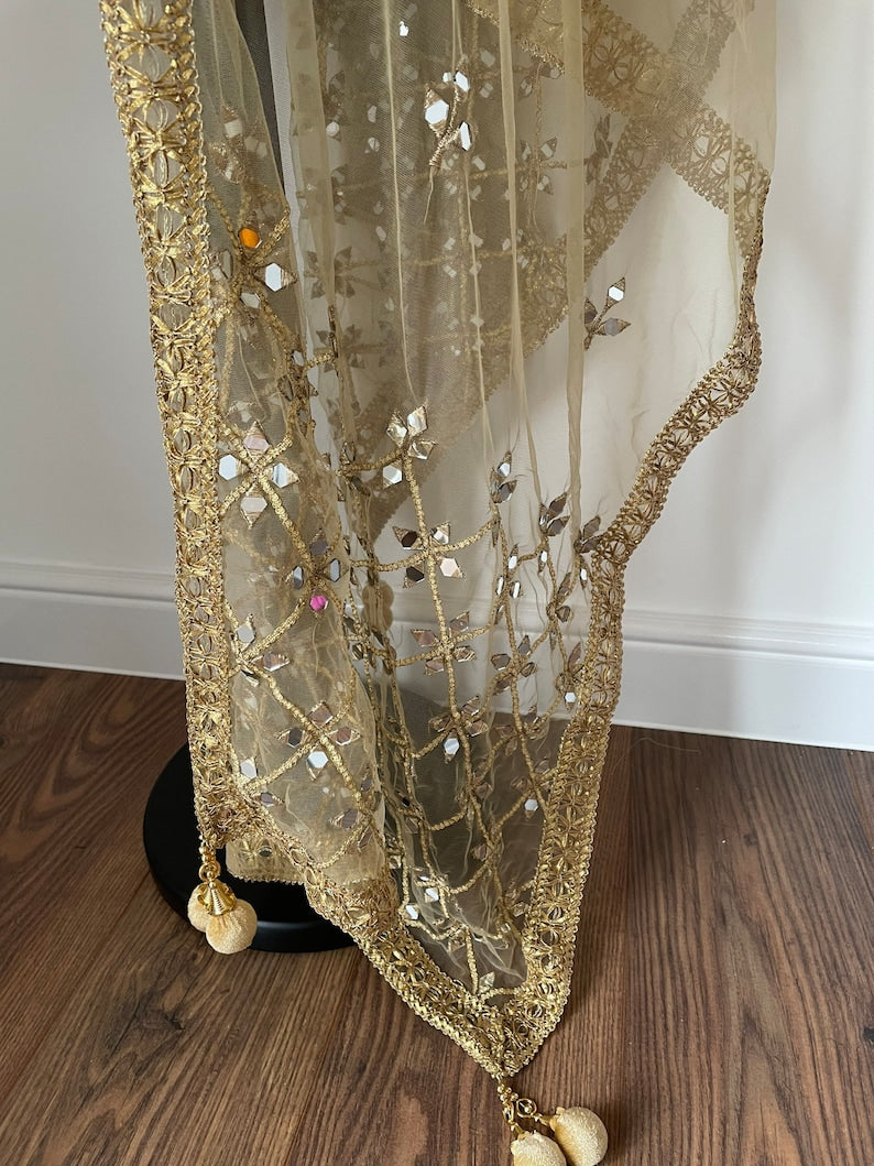 Net mirror work Stole width Duppatta mirror work embroidery with highlighting all over the stole. Four corners finished with lattu/ball tassel. On the Golden Duppatta this is Lattu will be either covered with golden silver lace or velvet fabric