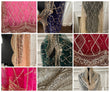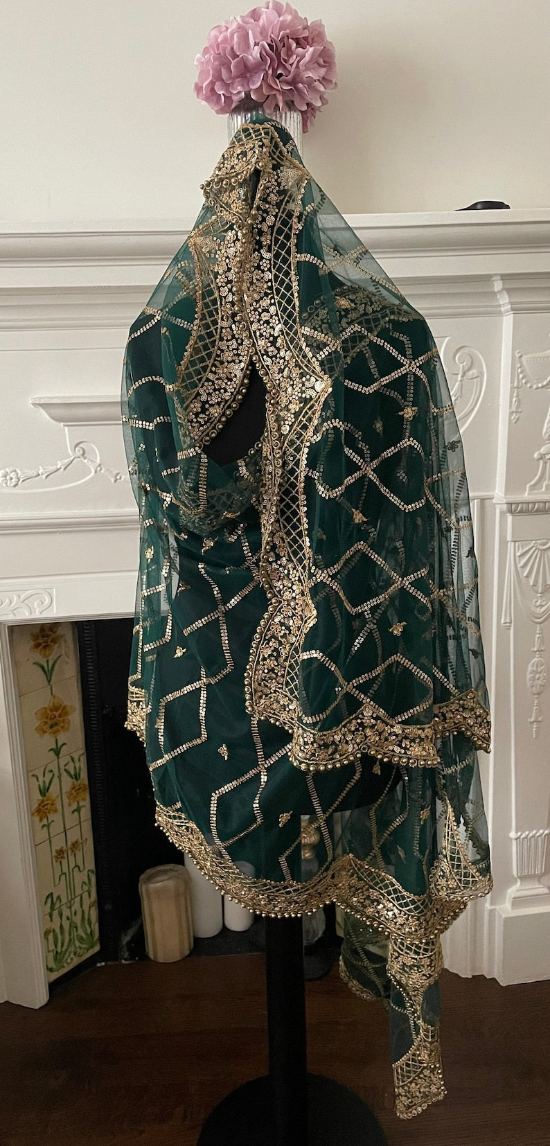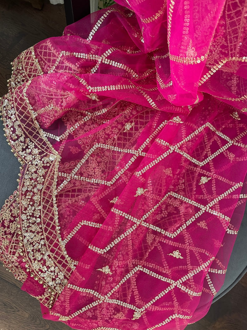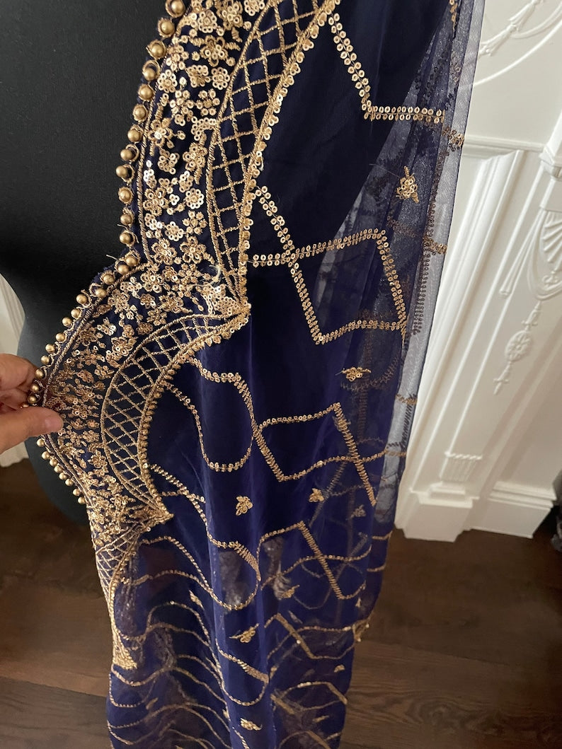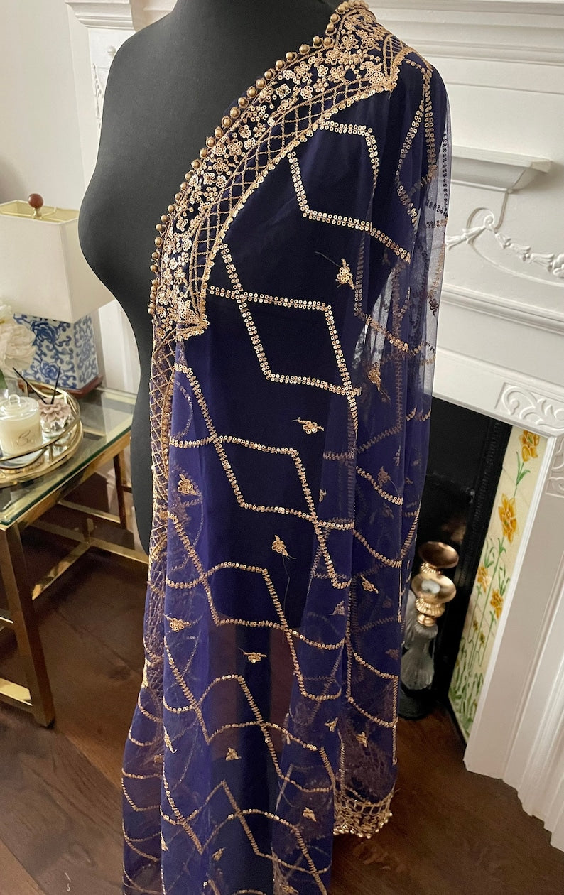 Length 2.5 meter length, 32-33 inch width approximate. Broad border along the length and slimmer border at the ends. Golden beads on all four sides. All over Rhombus sequin sippi jaal work