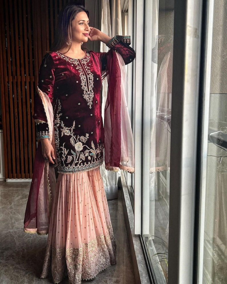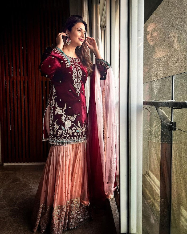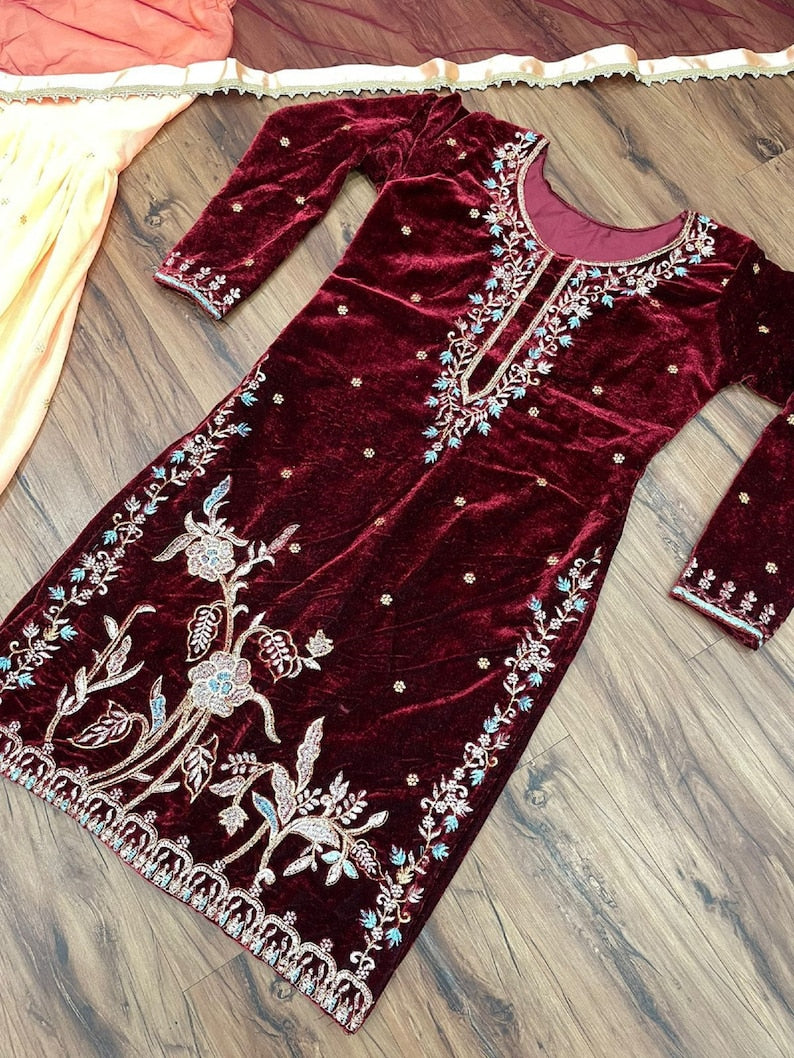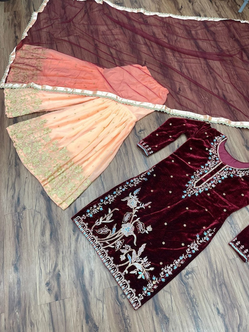 Description Looking for this same colour beautiful Designer Suit On havy Velvet febric and Thred work and sharara on Georgette febric with inner and thred work and dupatta on soft net Febric with Lace work .