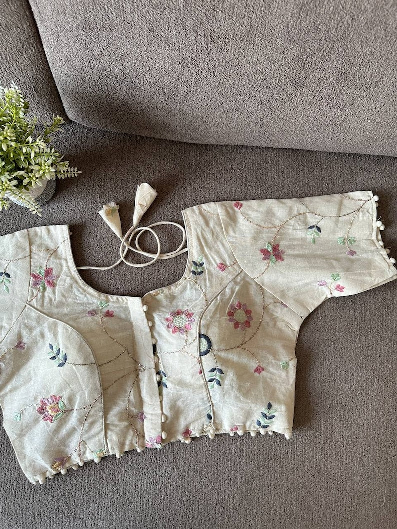 Off White Khadi Cotton Embroidery Readymade Designer Saree Blouse Women Stitched Sari Choli India Wedding Wear Fabric Craft Tunic Crop Top