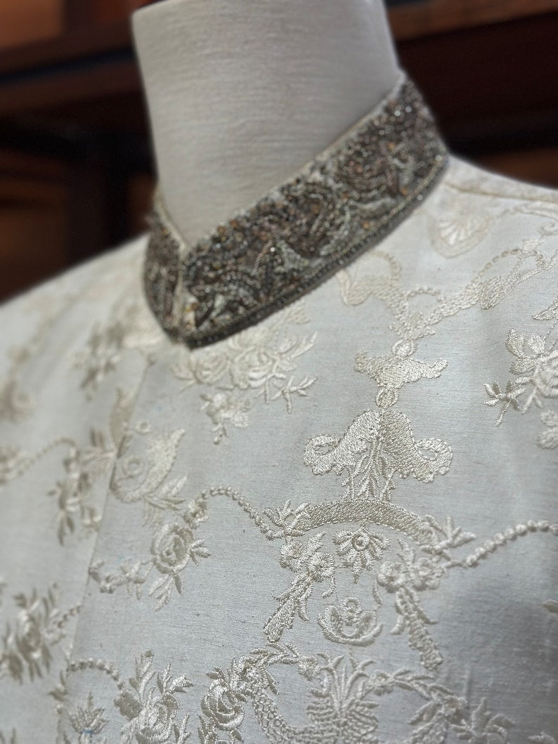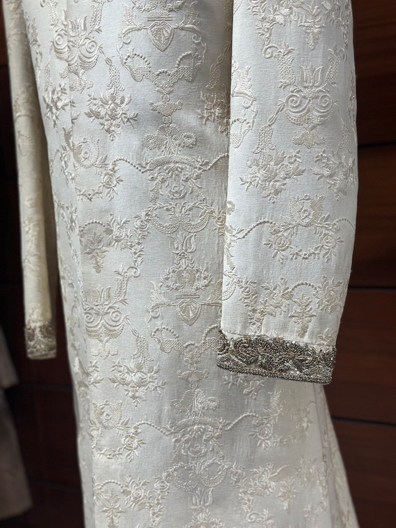 With our men's Off-White Embroidered Silk Sherwani, you can exude elegance. A gorgeous embroidered floral print adorning the silk foundation exudes sophistication. The hand-stitched zardozi work on the cuffs and collar gives it a royal touch, making it the ideal grooms wear for his special day.
