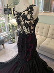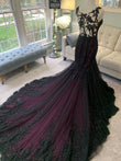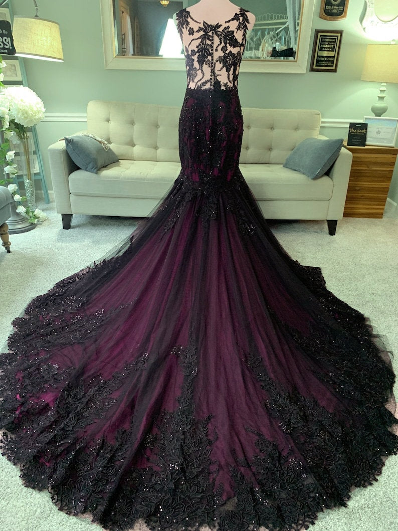 This gorgeous Black and Purple Wedding Dress or Gothic Wedding Dress was designed and created for our bride Rayne and it is the perfect choice for the elegant bride who wants a themed wedding with alternative colors . It features beautiful black lace with an illusion back that is a total show-stopper. The sequins on the lace add a gorgeous touch to it, and its Trumpet Wedding Dress Style would give any bride the perfect sexy silhouette. All dresses come with sewn in cups, and be customized in any size+ colors.