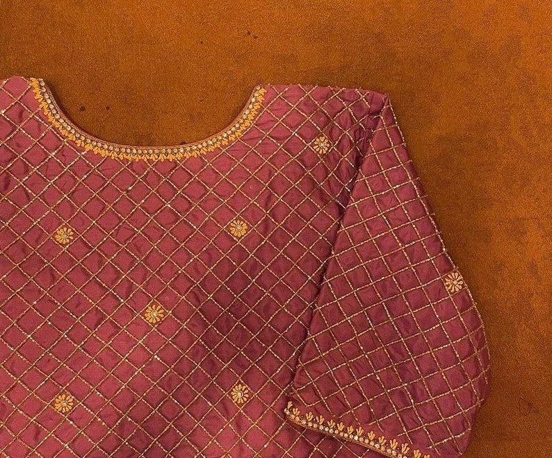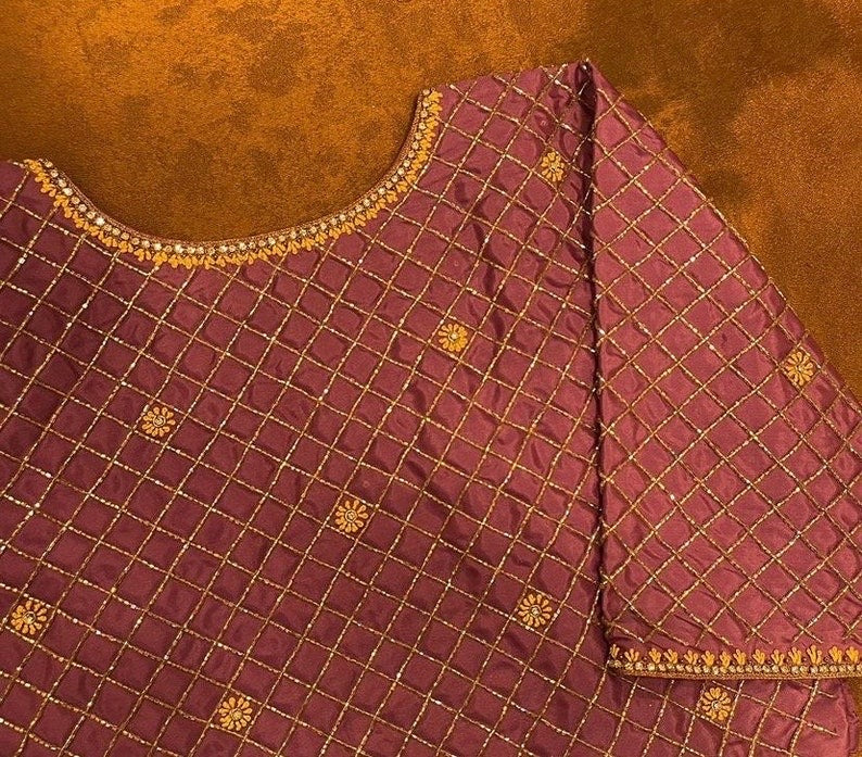 Neck: deep curved neck about 8 inch deep with hand embroidery and back high neck