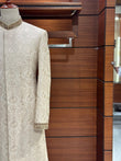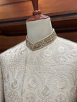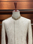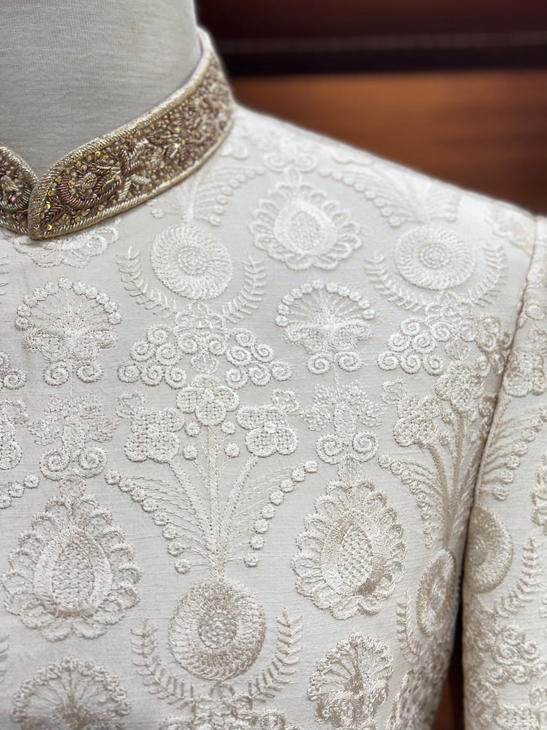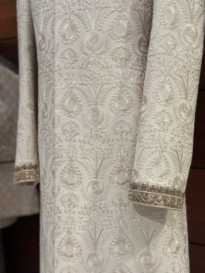 Step into opulence with our Cream White Men's Sherwani, a masterpiece made up of pure embroidered karandi fabric adorned with hand stitched zardozi work on the collar and cuffs. Delicate floral prints dance across the fabric, creating a canvas of timeless elegance.