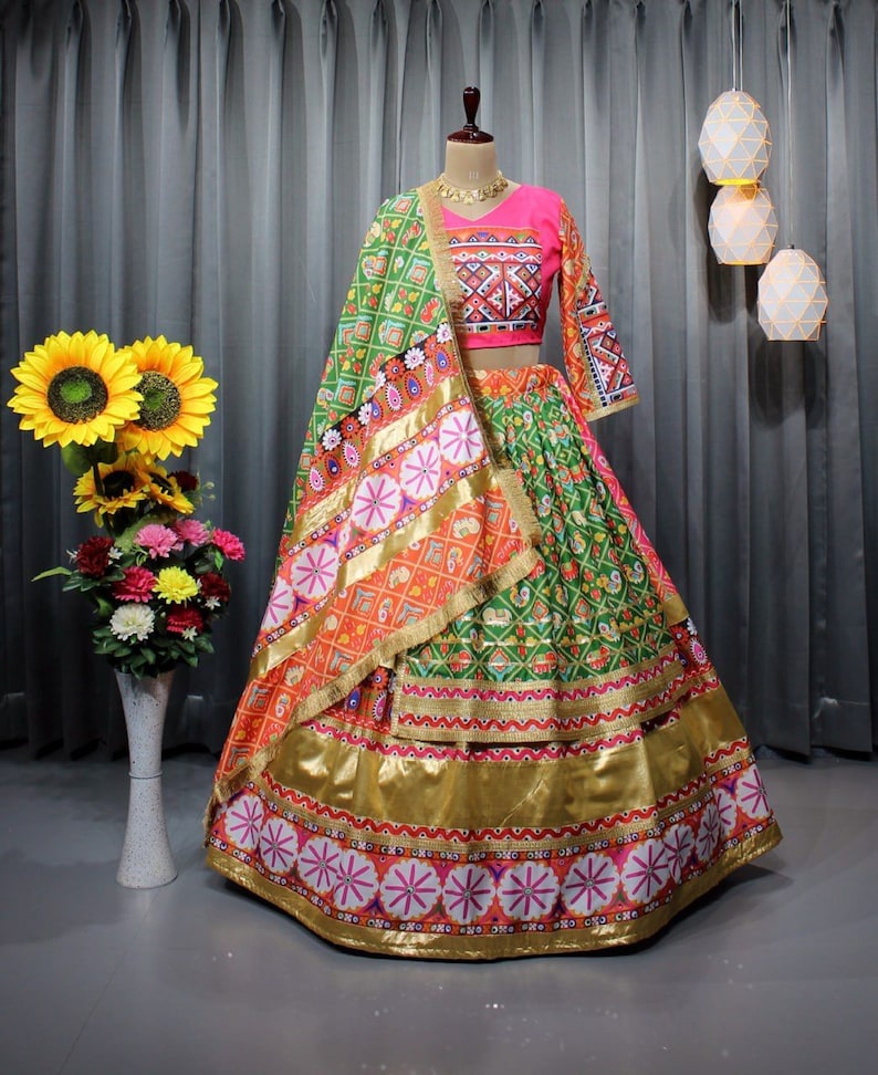Lehenga : Heavy Butter Silk With Digital Print & 4 Mtr Flair Fully Stitch With Fully Real Mirror Work & Gotapatti Work