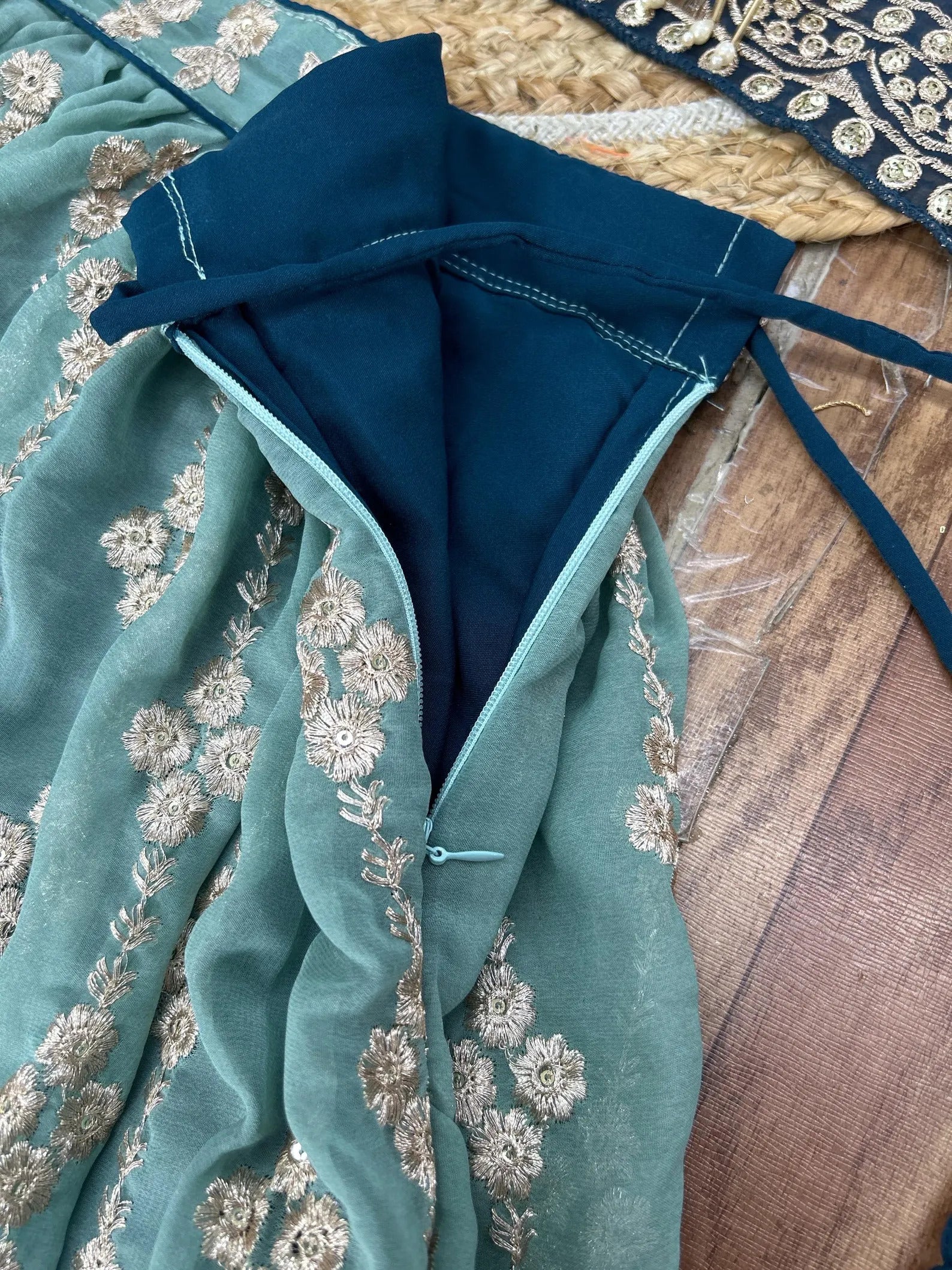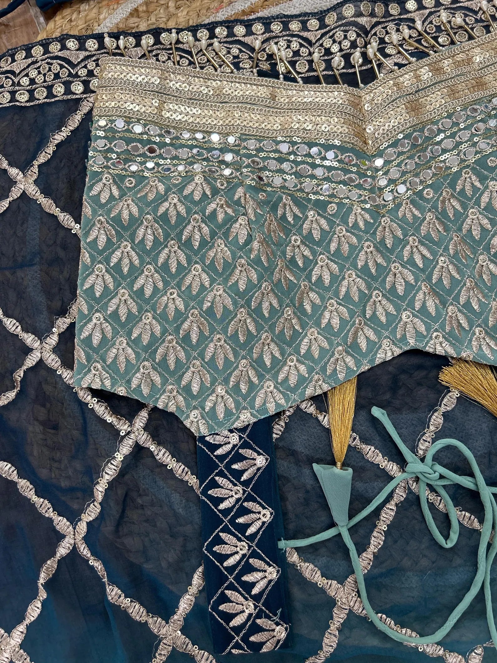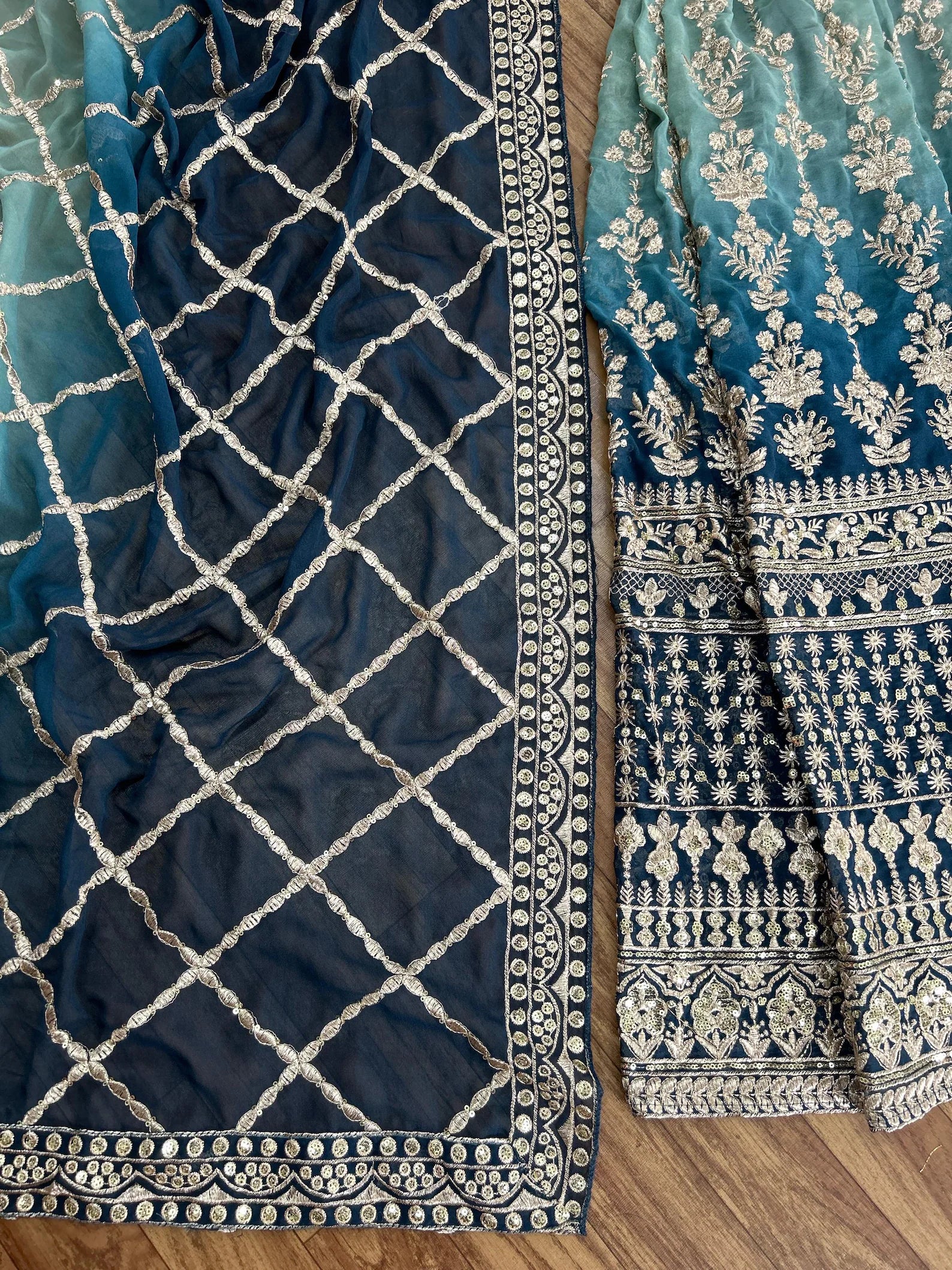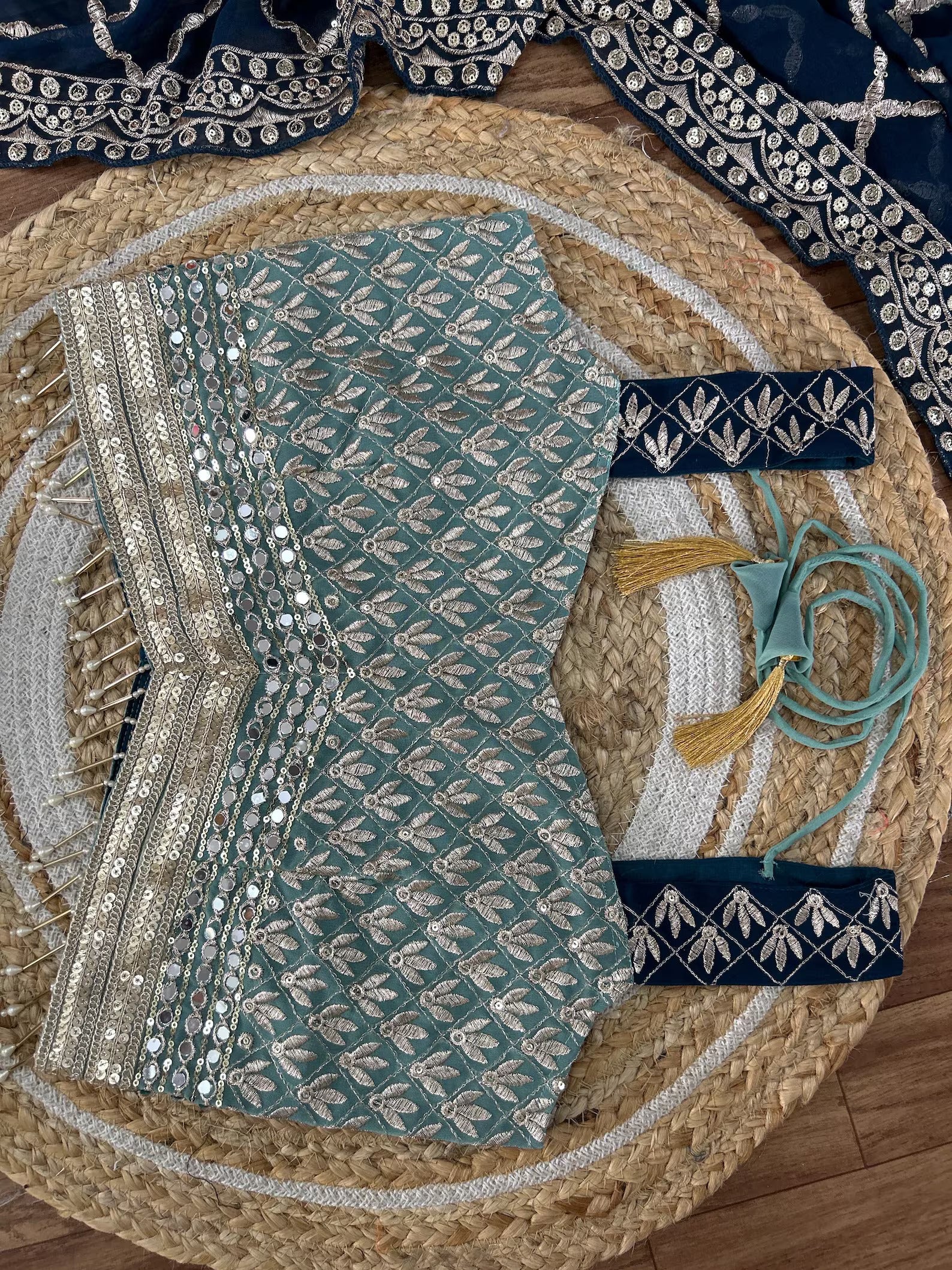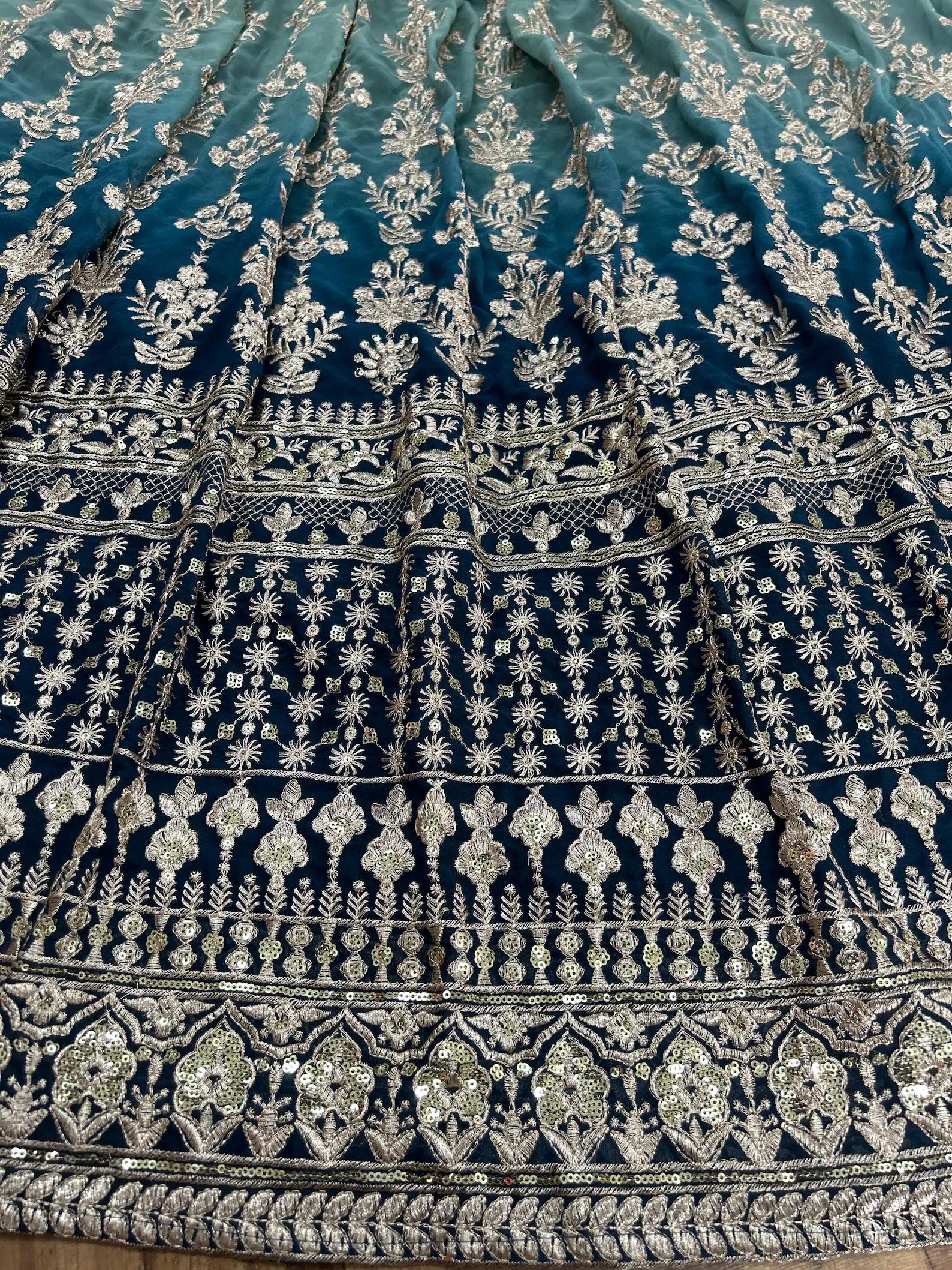 Premium Faux Blooming adorned with heavy sequins and intricate zari embroidery