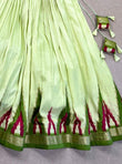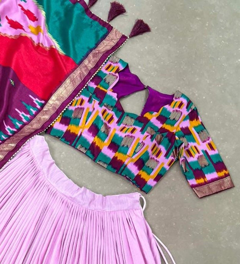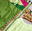 Fluorescent green and red printed lehenga choli with dupatta, has foil print technique and gotta patti