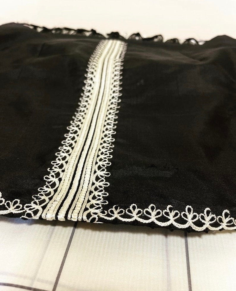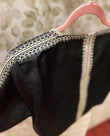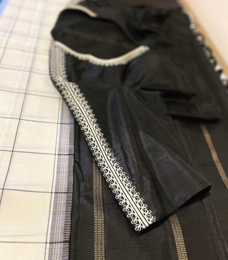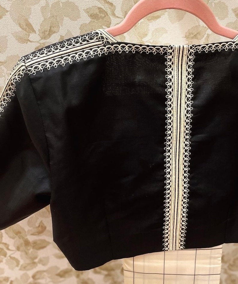 Here is a beautiful Hand embroidered saree blouse in black color that has simple yet unique embroidery on necks and sleeves with intricate white thread and pearl hand embroidery all over as shown!! blouse has simple elbow sleeves as shown , Runs with any self or contrast color saree ! Please message us for any color / size customization