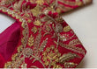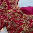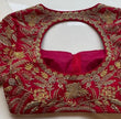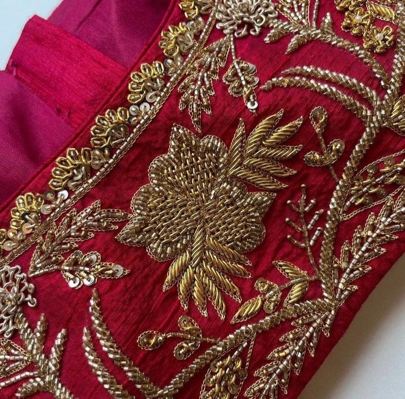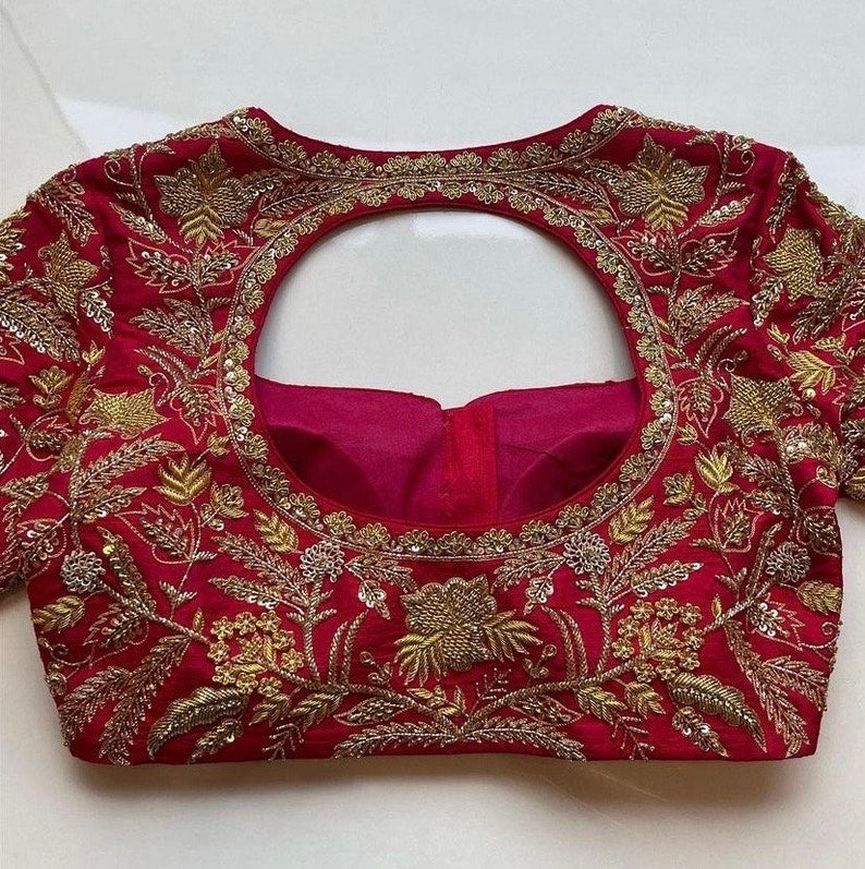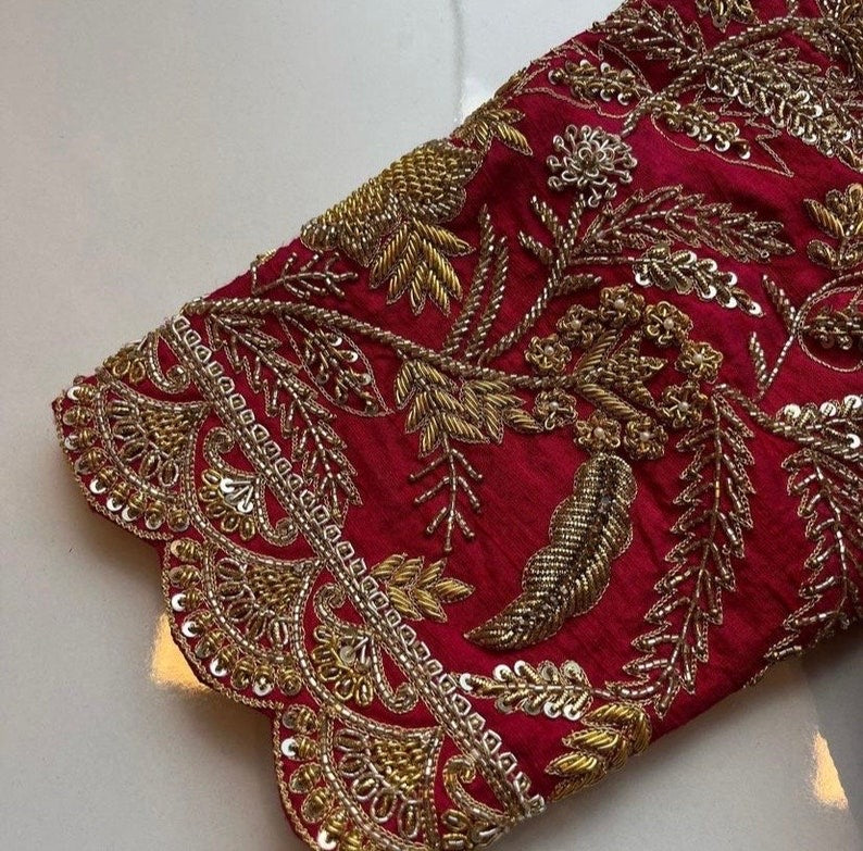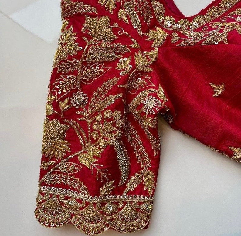 Here is a beautiful Hand embroidered heavy zardosi work saree blouse in red color that has curved neck design with heavy all over embroidery as shown!! Perfect for wedding and bridal , can be customized in any color !! Please message us for any wedding / bridal blouse customization !!