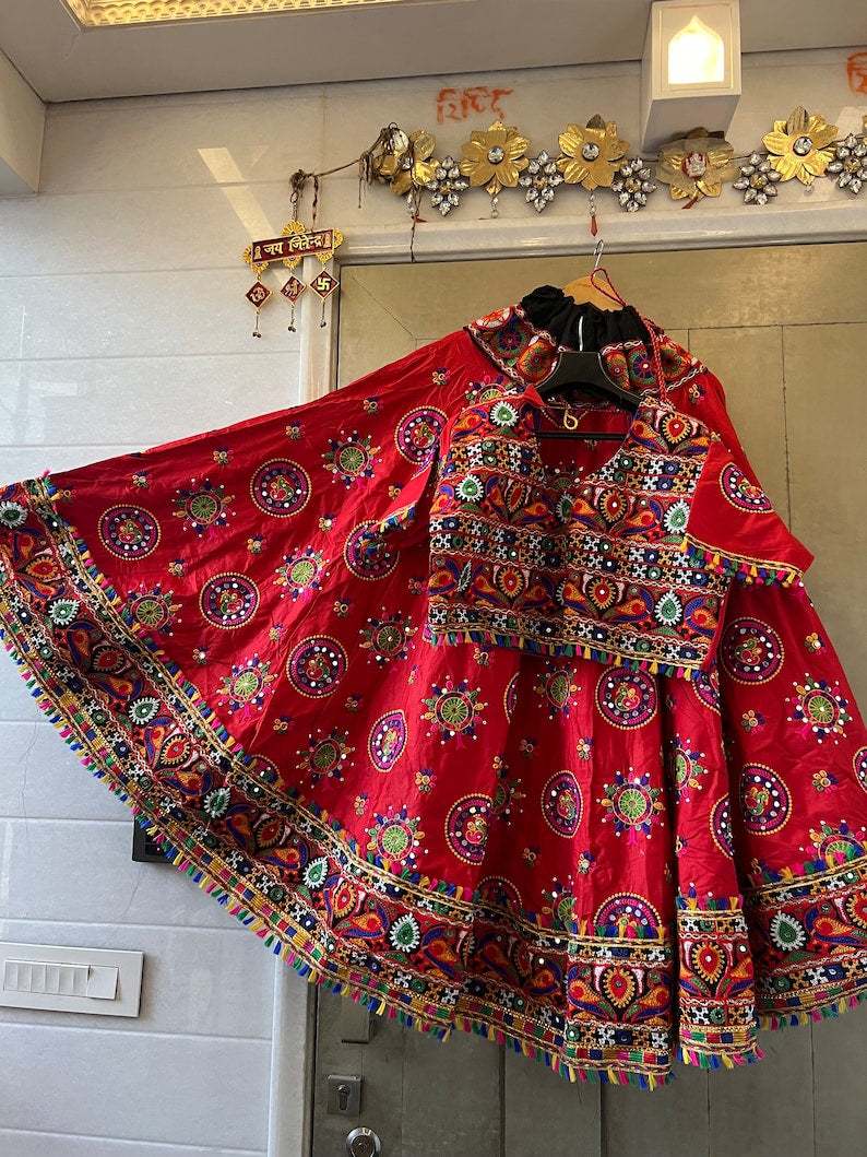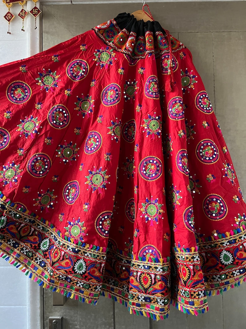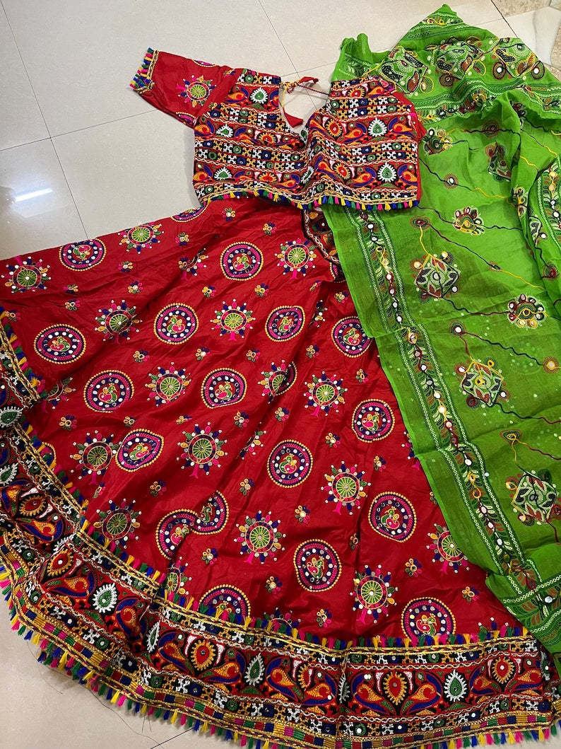 - Red and green full kamati work/ kutch work chaniya choli set of full circle 8 meter flare ghaghra, blouse and full size kutch work dupatta + ups delivery