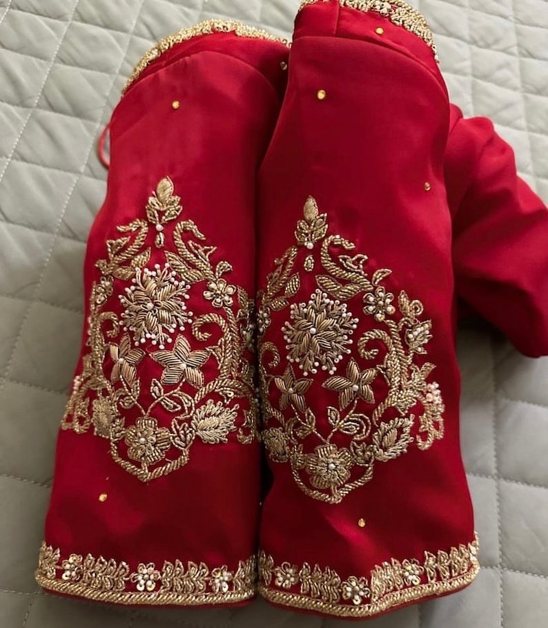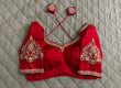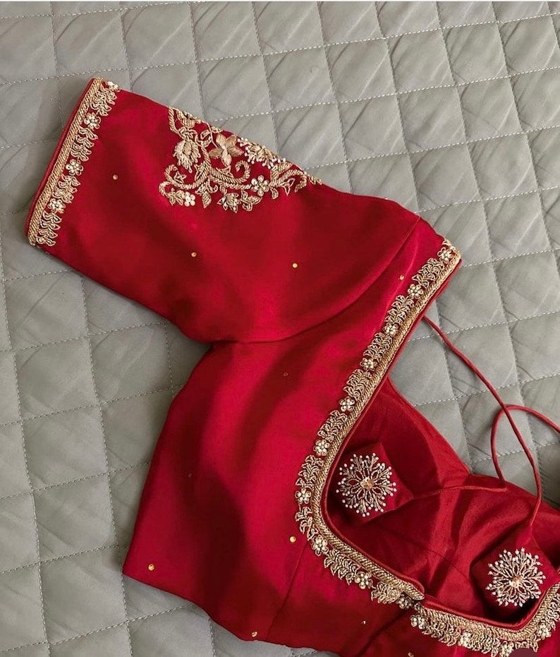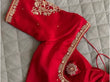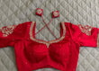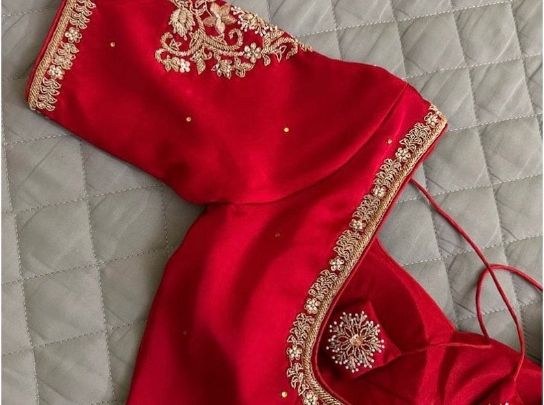 Here is a beautiful Hand embroidered zardosi work saree blouse in red color that has deep neck design front and back emblished with gold and antique zardosi embroidered on neck sleeves front and back as shown!! Runs with any self or contrast color saree ! Please message us for any color / size customization