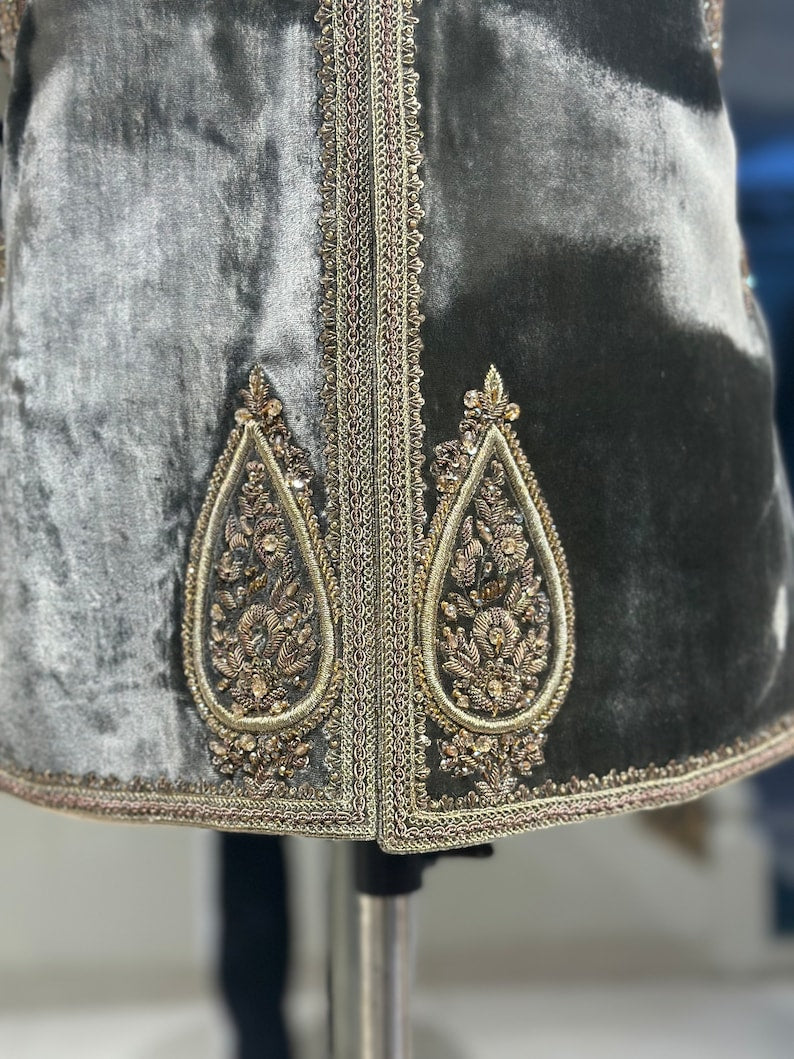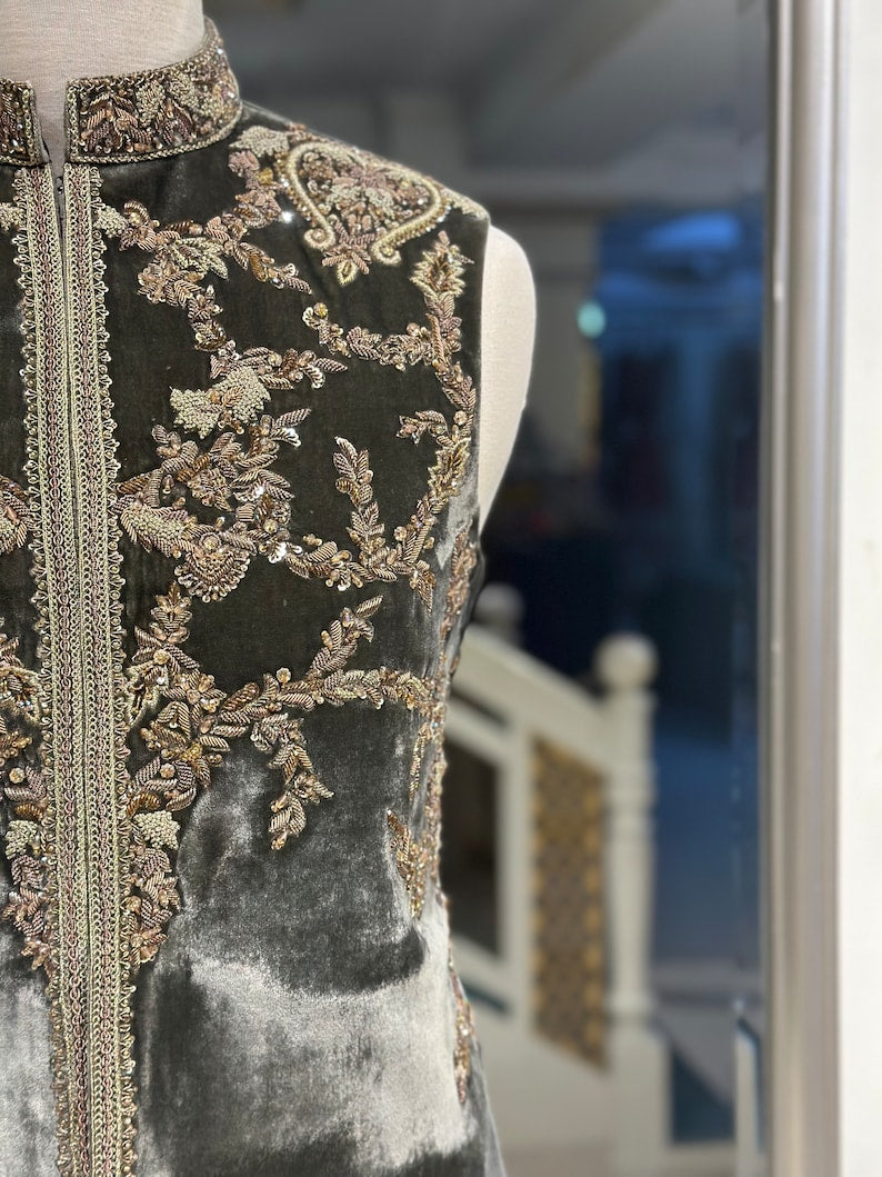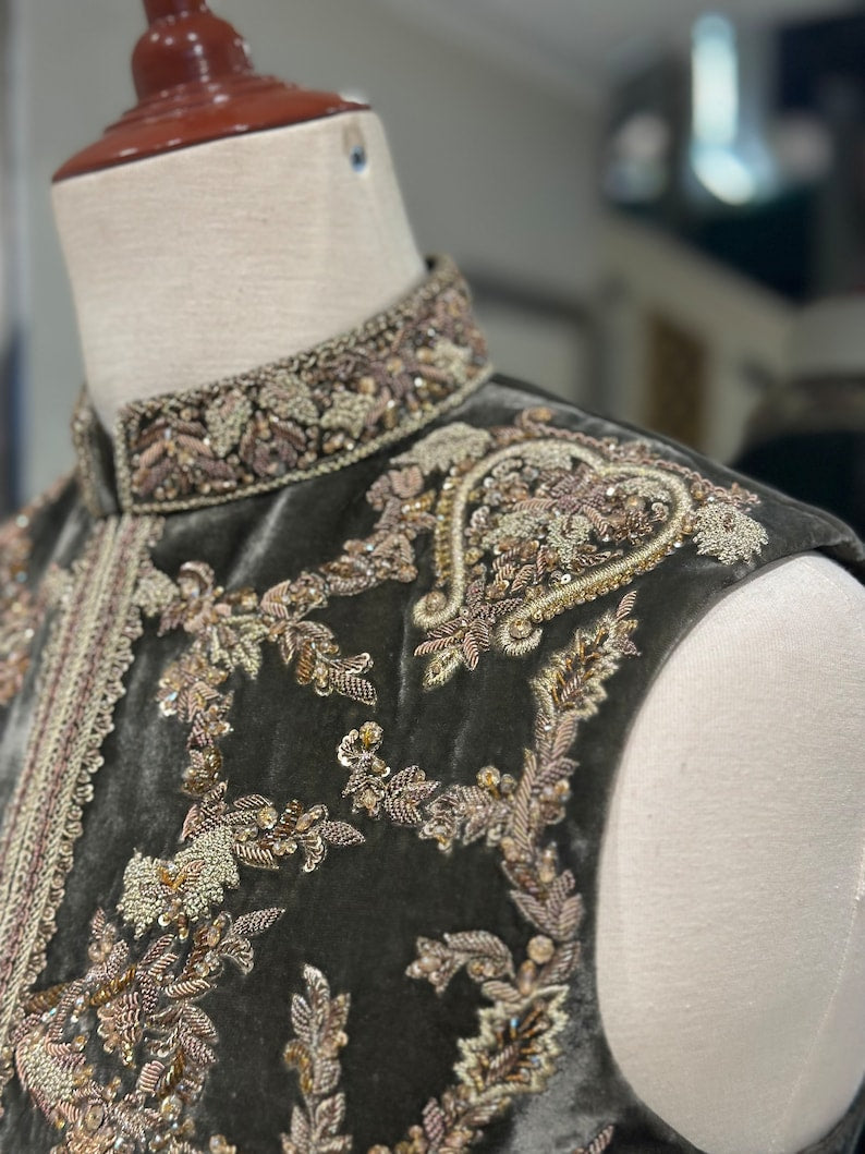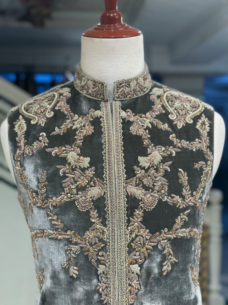 Hand-stitched Zardozi Work on the front of the waistcoat, skirtings and the bottom waistcoat tells the story of a timeless elegance. The embroidery is made of various zari materials and has a classic charm. It complements traditional Indian/Pak Men's attire for any special occasion.
