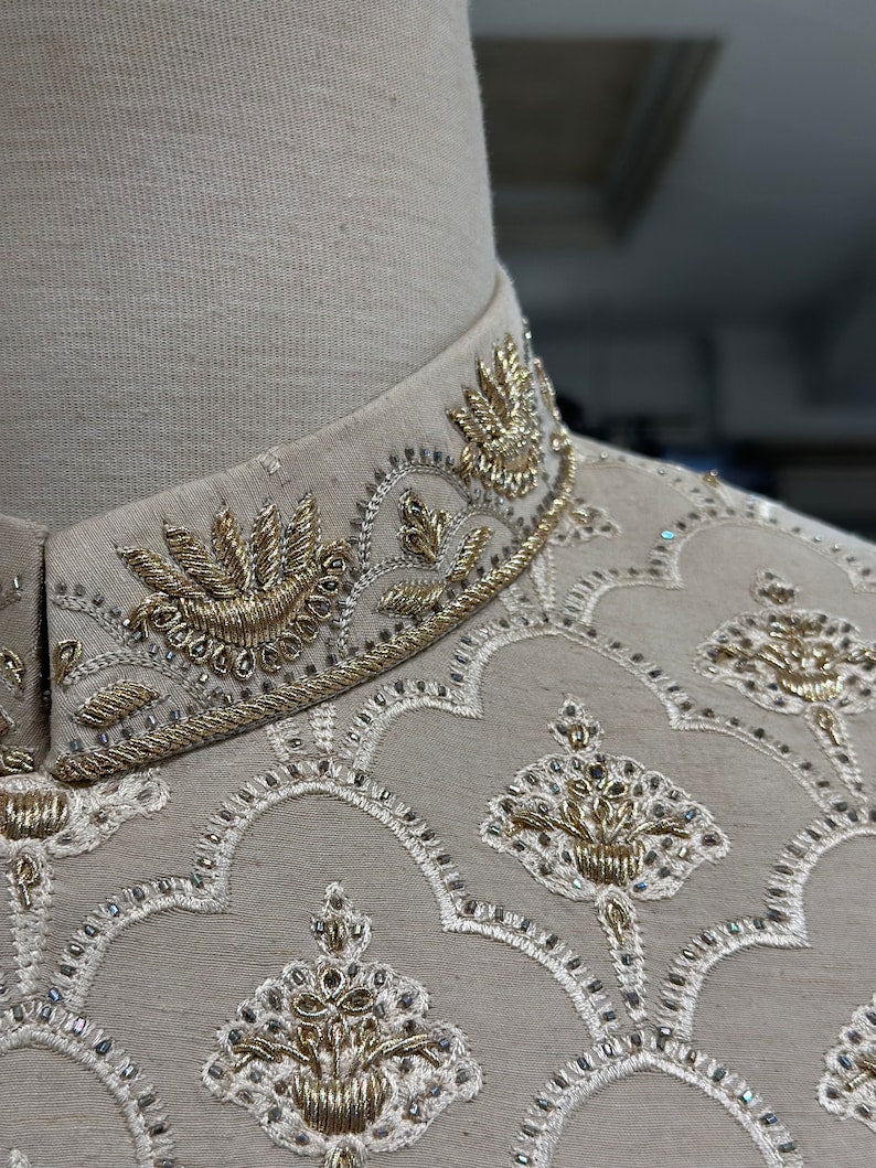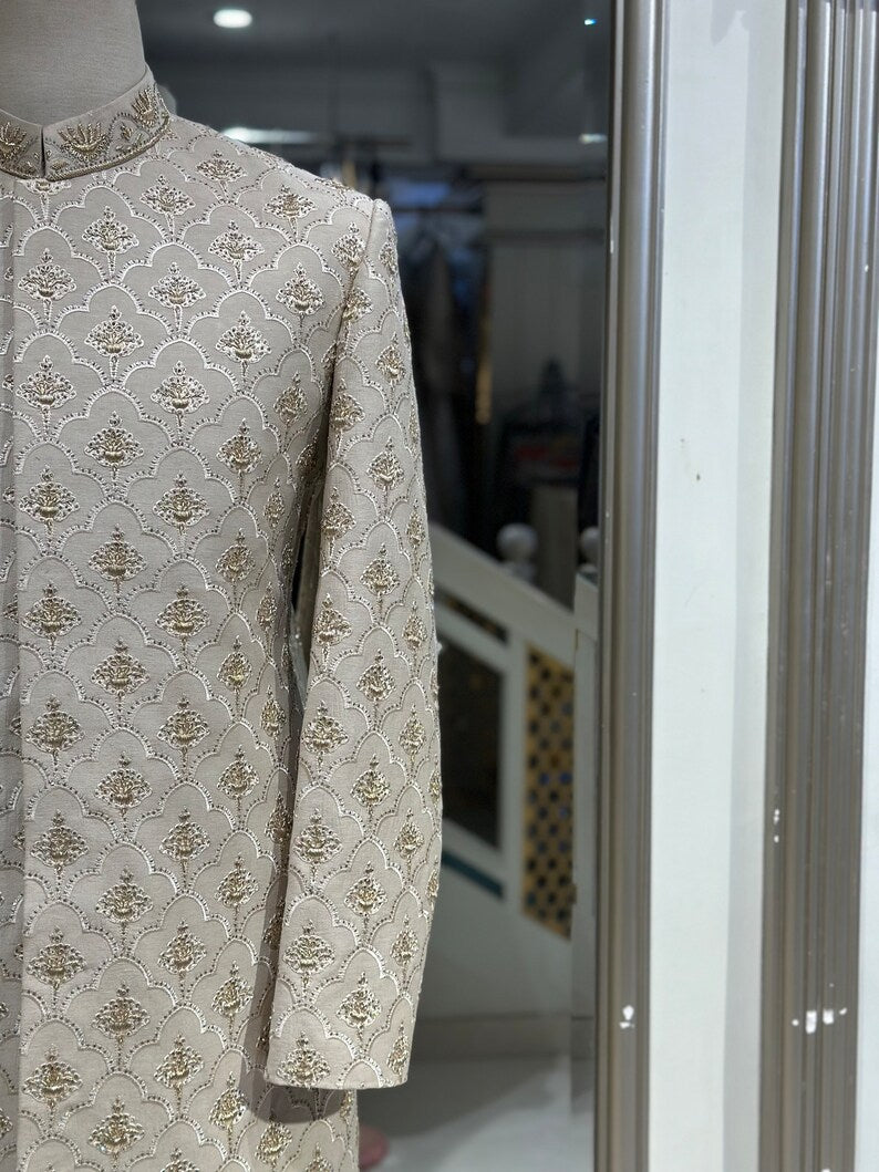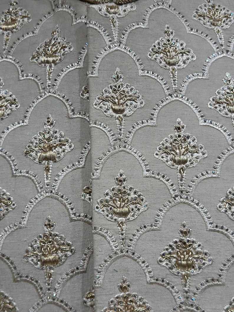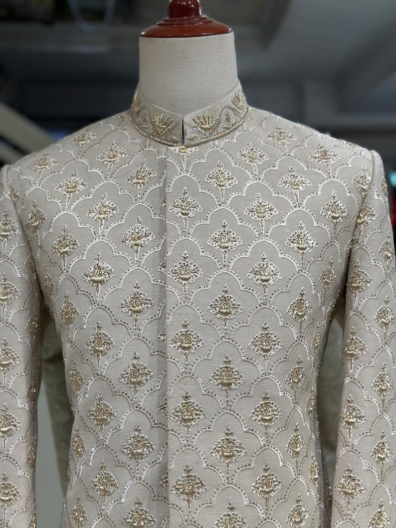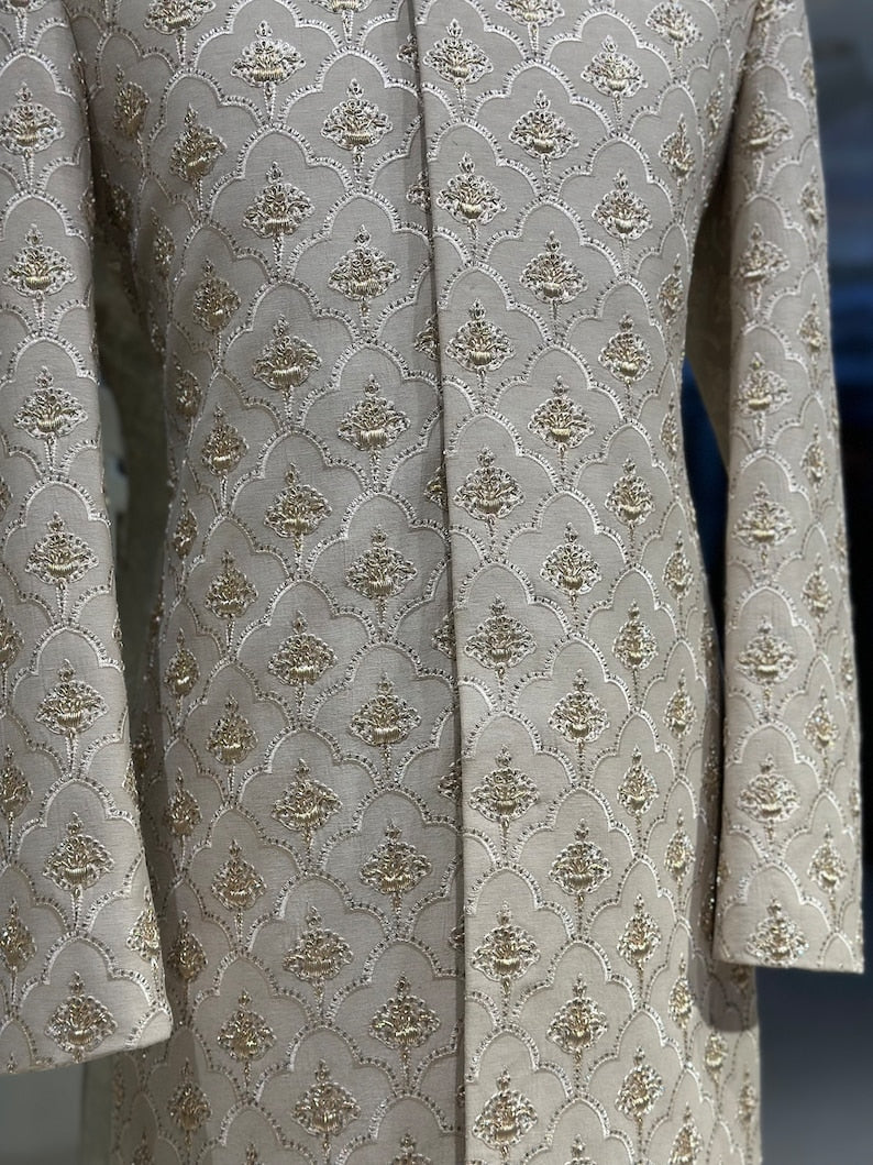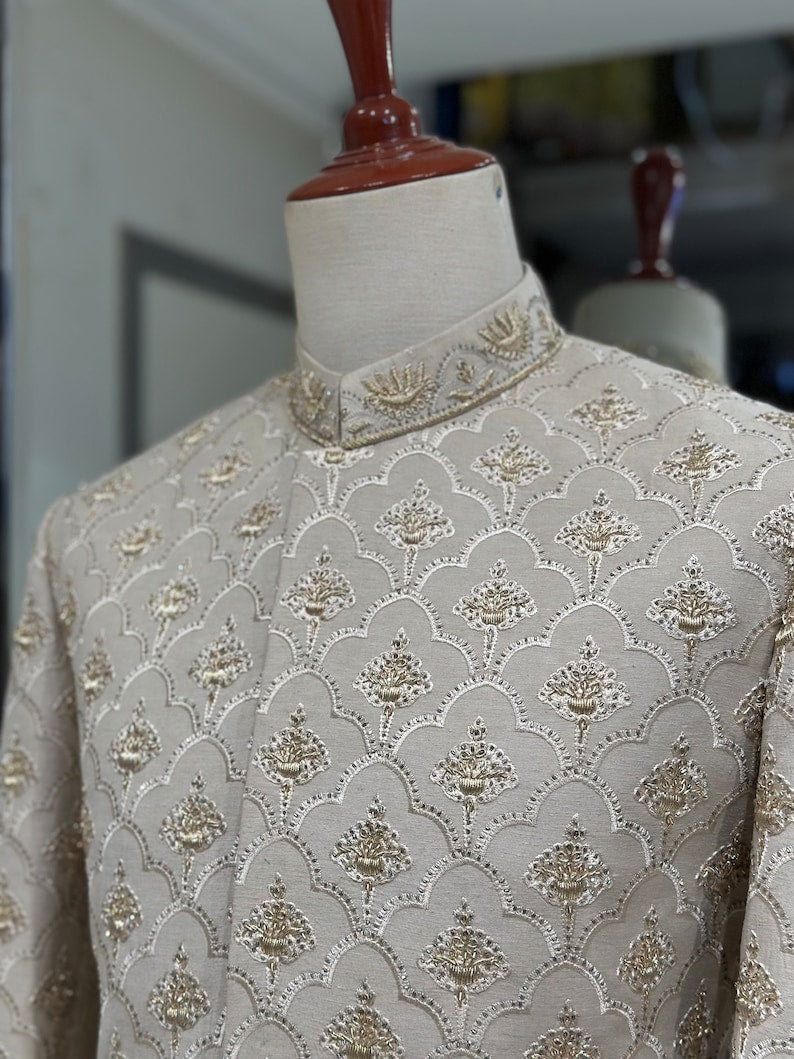 Presenting our exquisitely Off white embroidered karandi sherwani, a work of art created just for the groom's big day. This garment, which has hand-stitched work of zardozi and embroidery on the base of yhe fabric, exhibits a special fusion of elegance and artistry. Because the pure karandi fabric is so versatile, you can dye it any colour you want, and it will still feel sleek and cool and contour beautifully to your body.