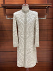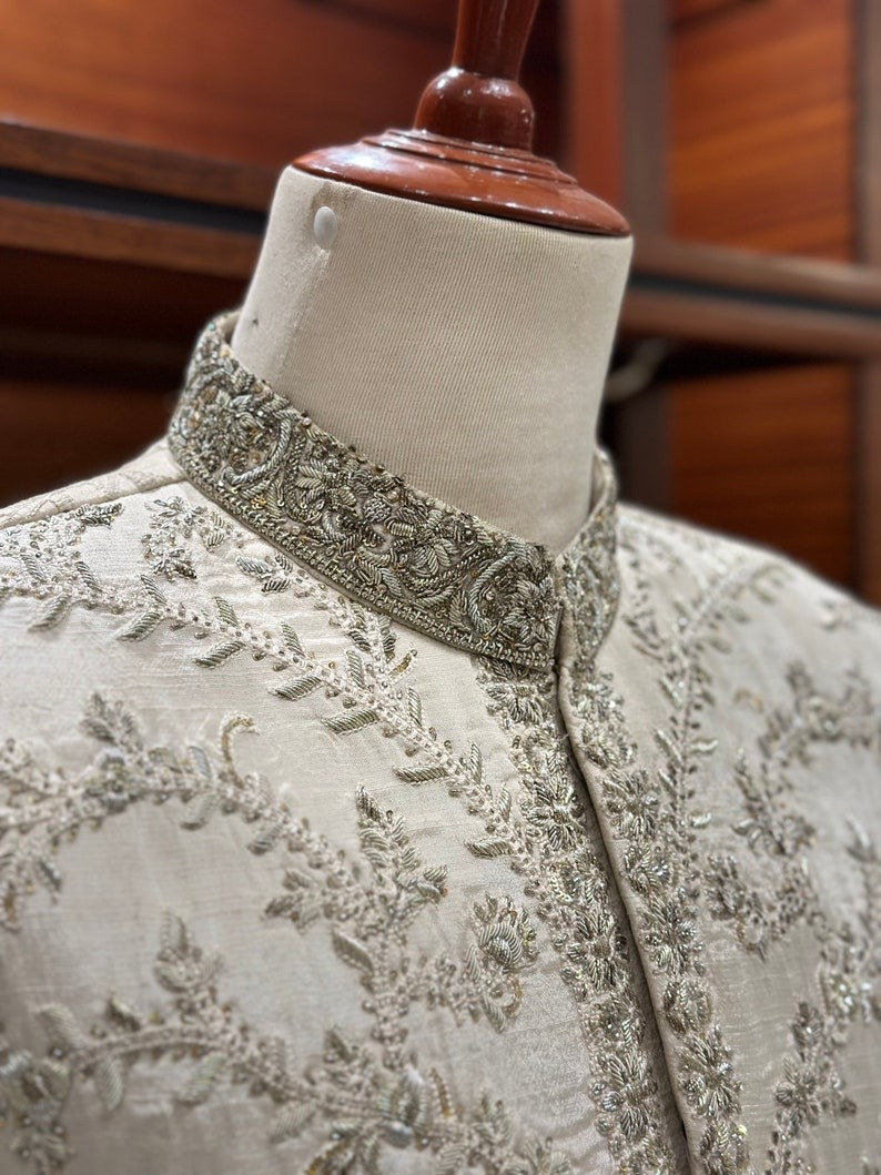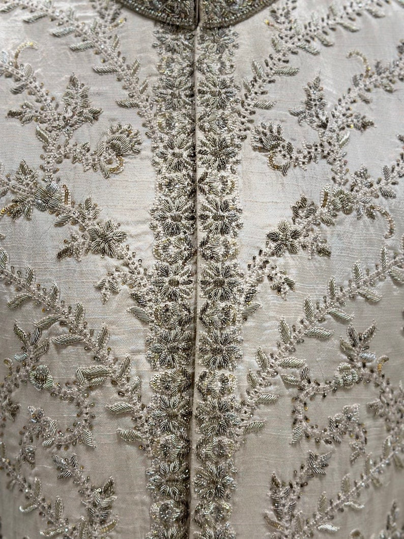 - Exquisite Floral Embroidery: The base features a floral-embroidered silk canvas, adorned with intricate zardozi work that gracefully embellishes the entire sherwani.