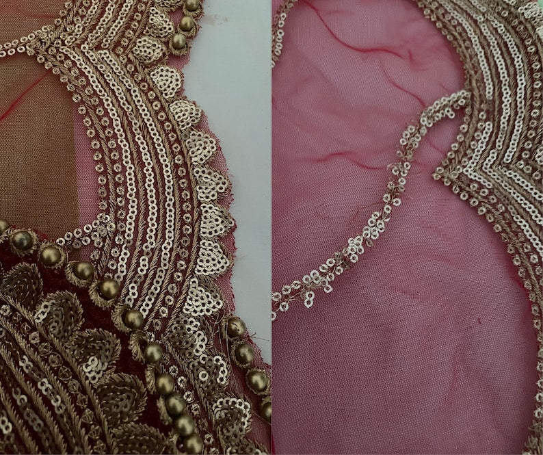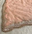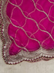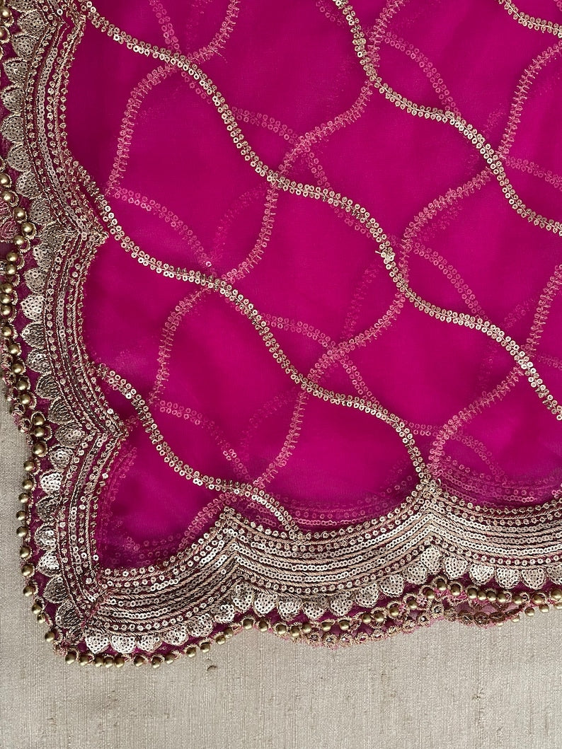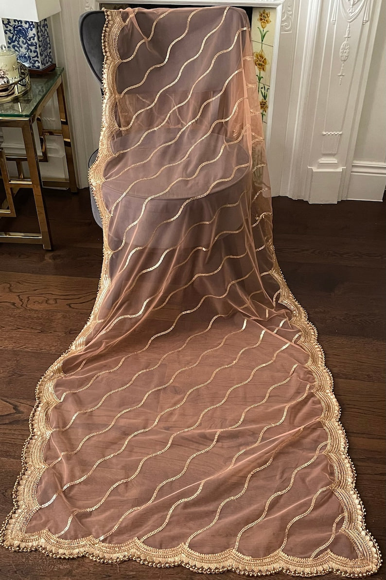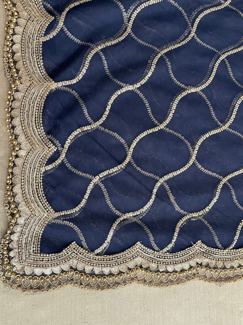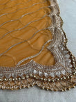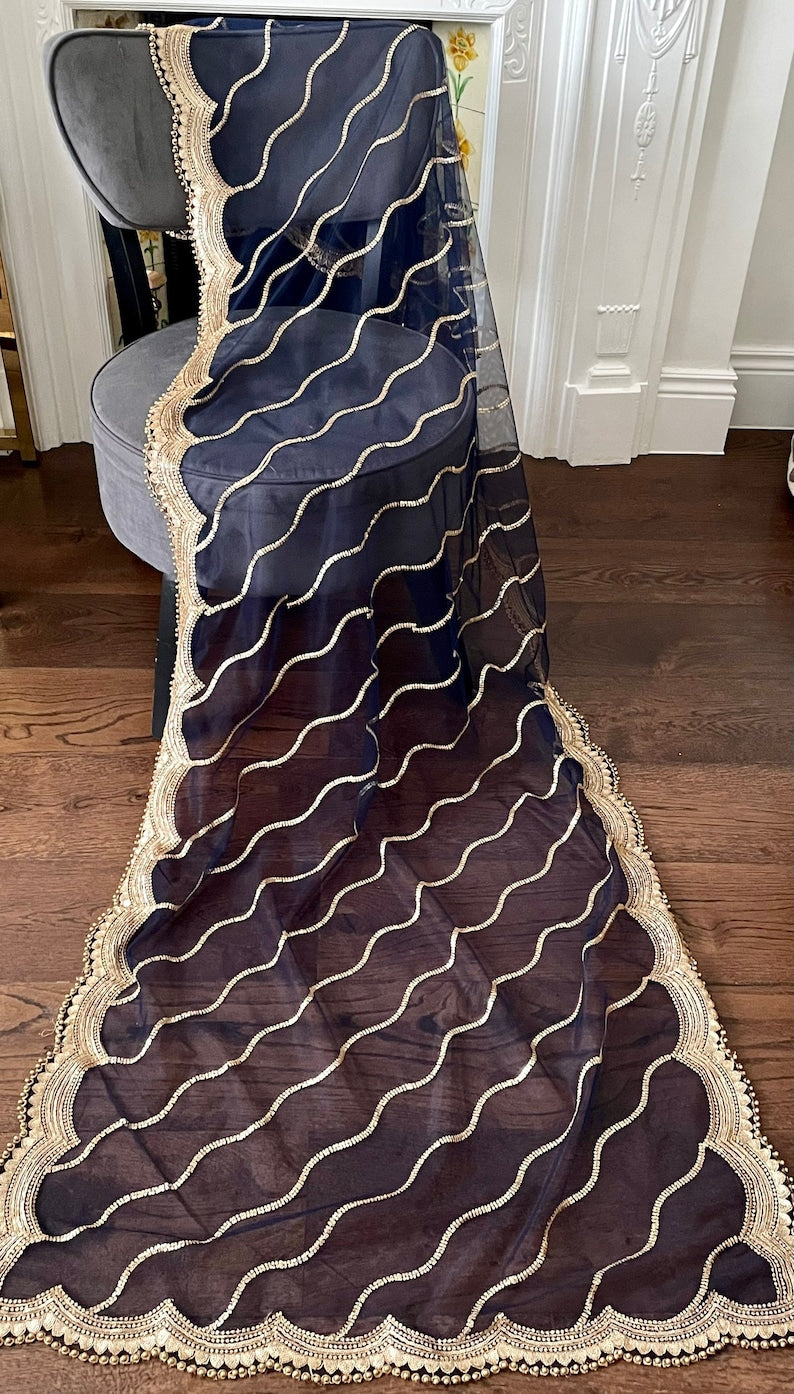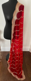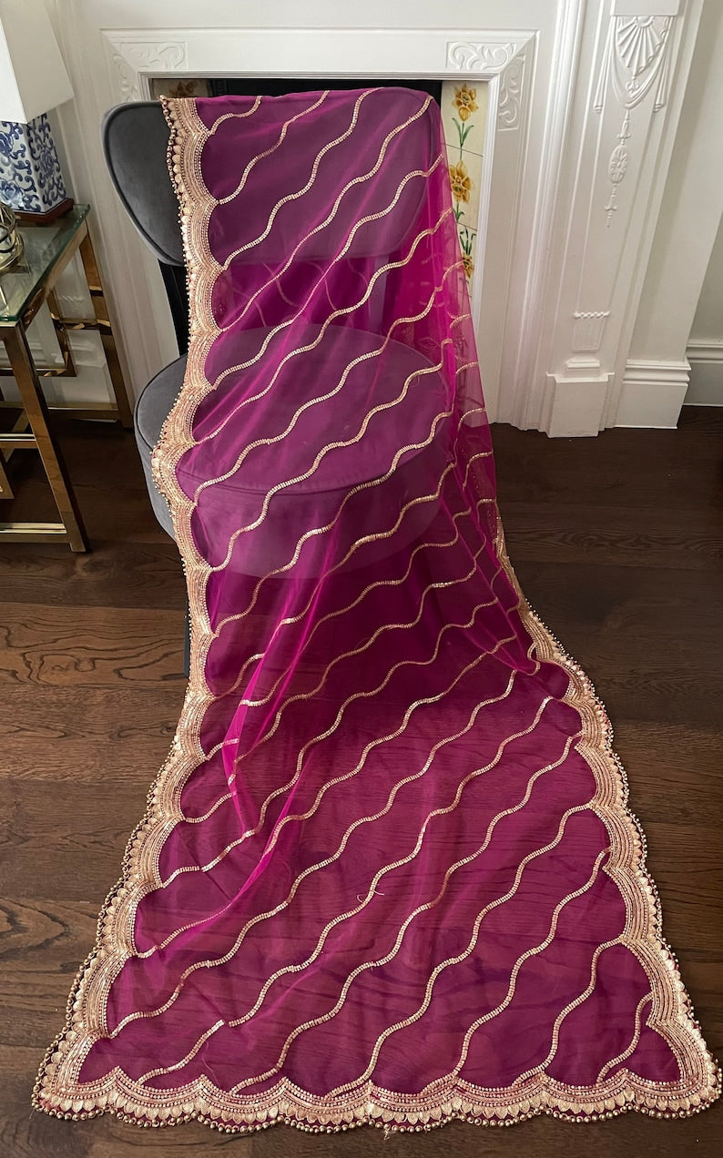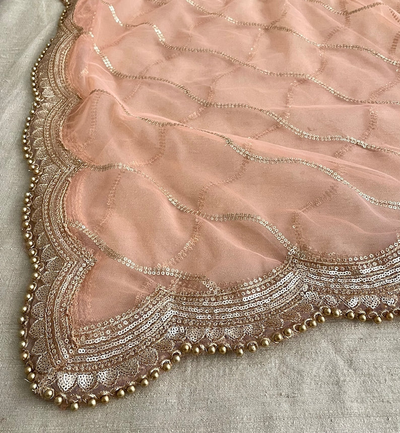 Net Duppattas thick border scalloped on two length side edges and ends finished with the slim version of the same border. Golden beads on all four sides