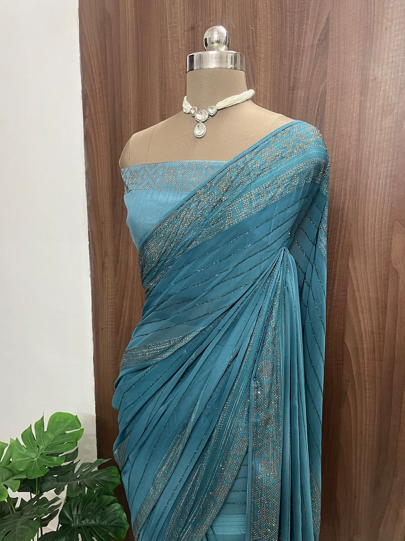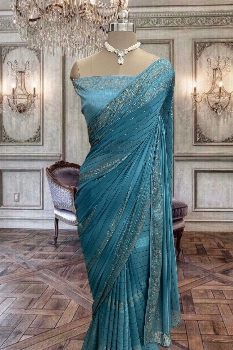 Shaded blue georgette saree with Kundan work and art silk blouse piece