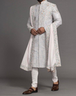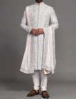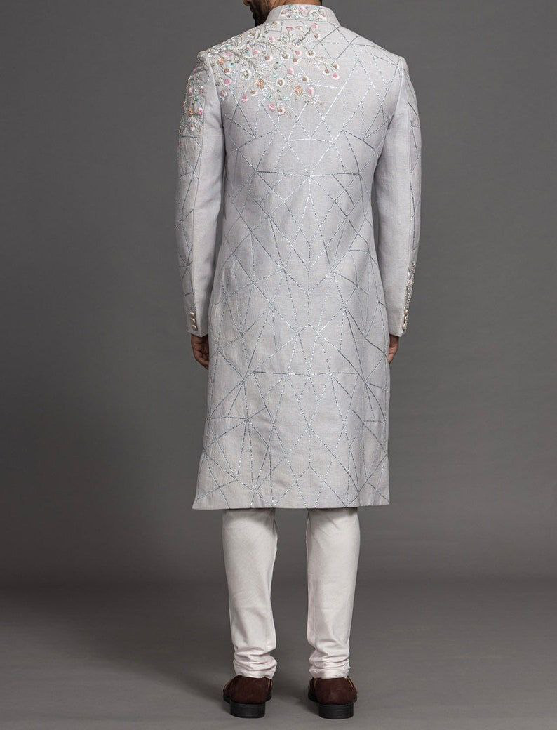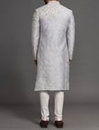 Silver Grey Embroidered Sherwani Set In Raw Silk with Dupatta and Mala