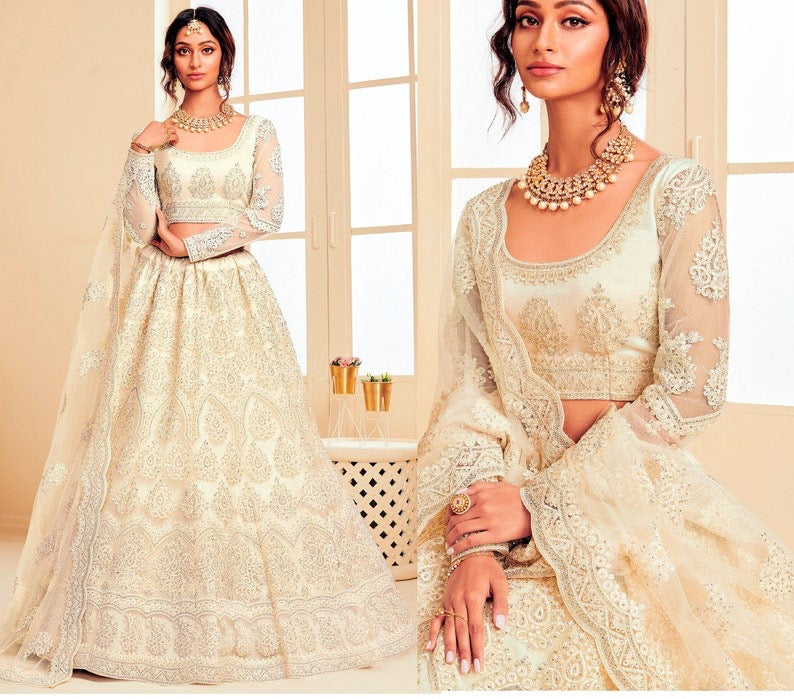 This Off White Heavy Embroidered Lehenga set features net fabric with heavy embroidery and thread work along with multicolor stone embellishments all over the Lehenga.This lehenga is so luxurious because of its work details, designs and rich embroidery, comes with cancan & canvas.Dupatta is on net with four side border and butti work all over the dupatta along with heavy stone embellishments.